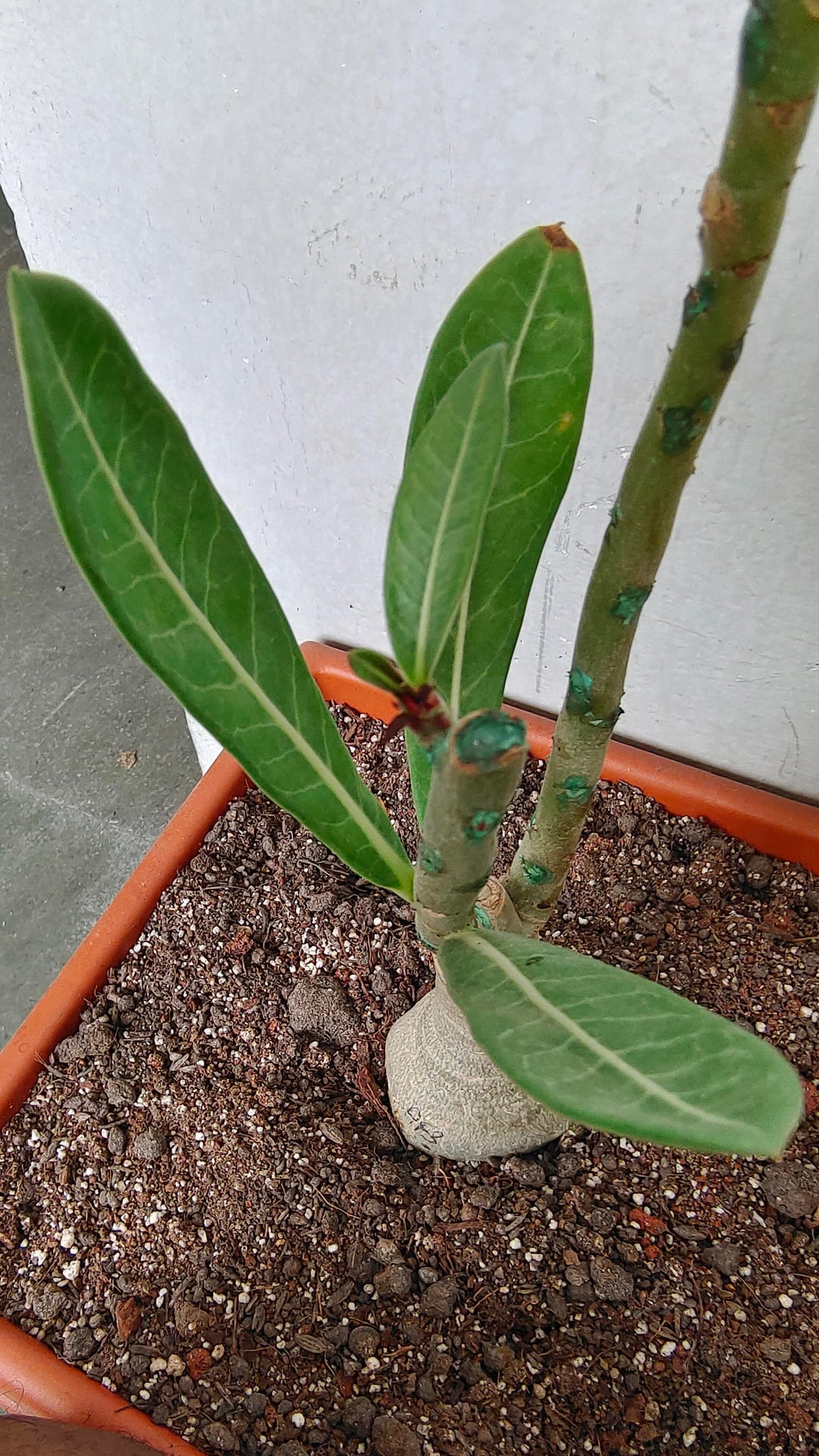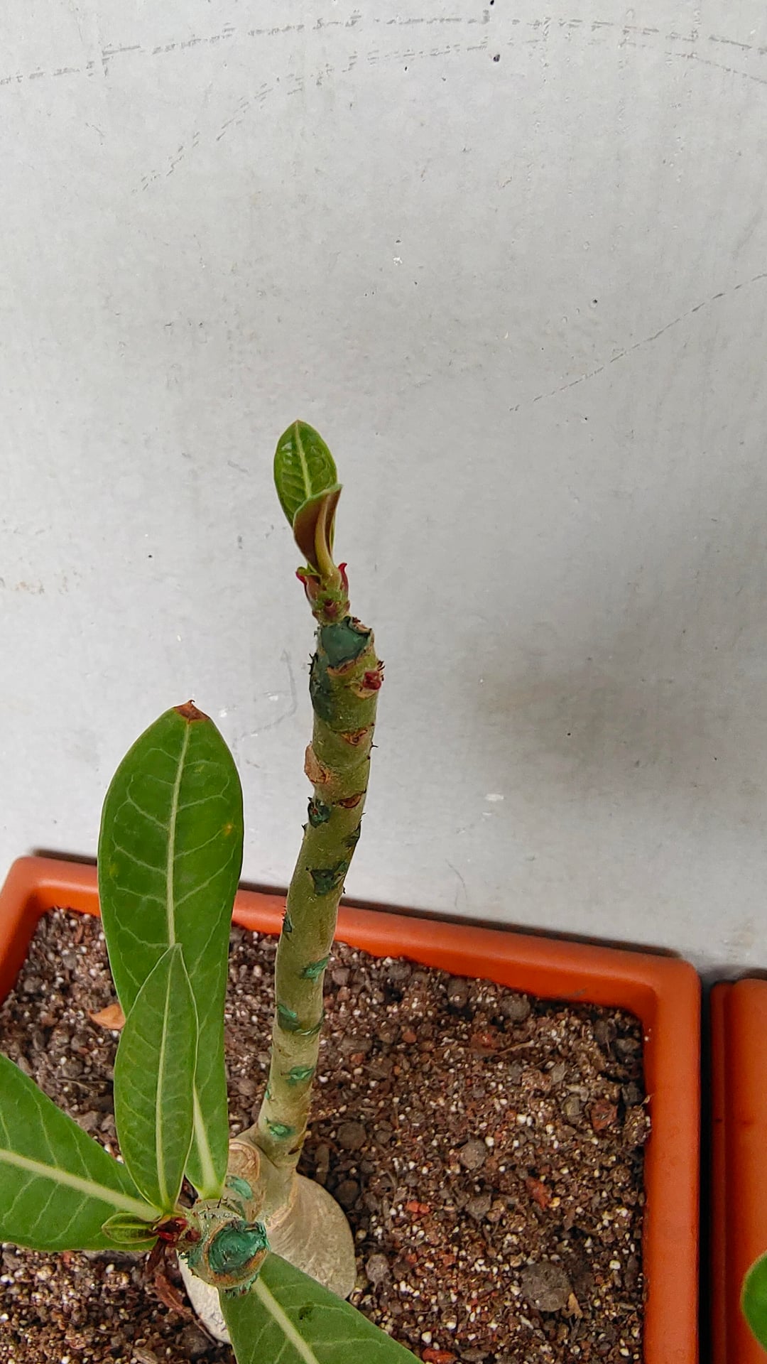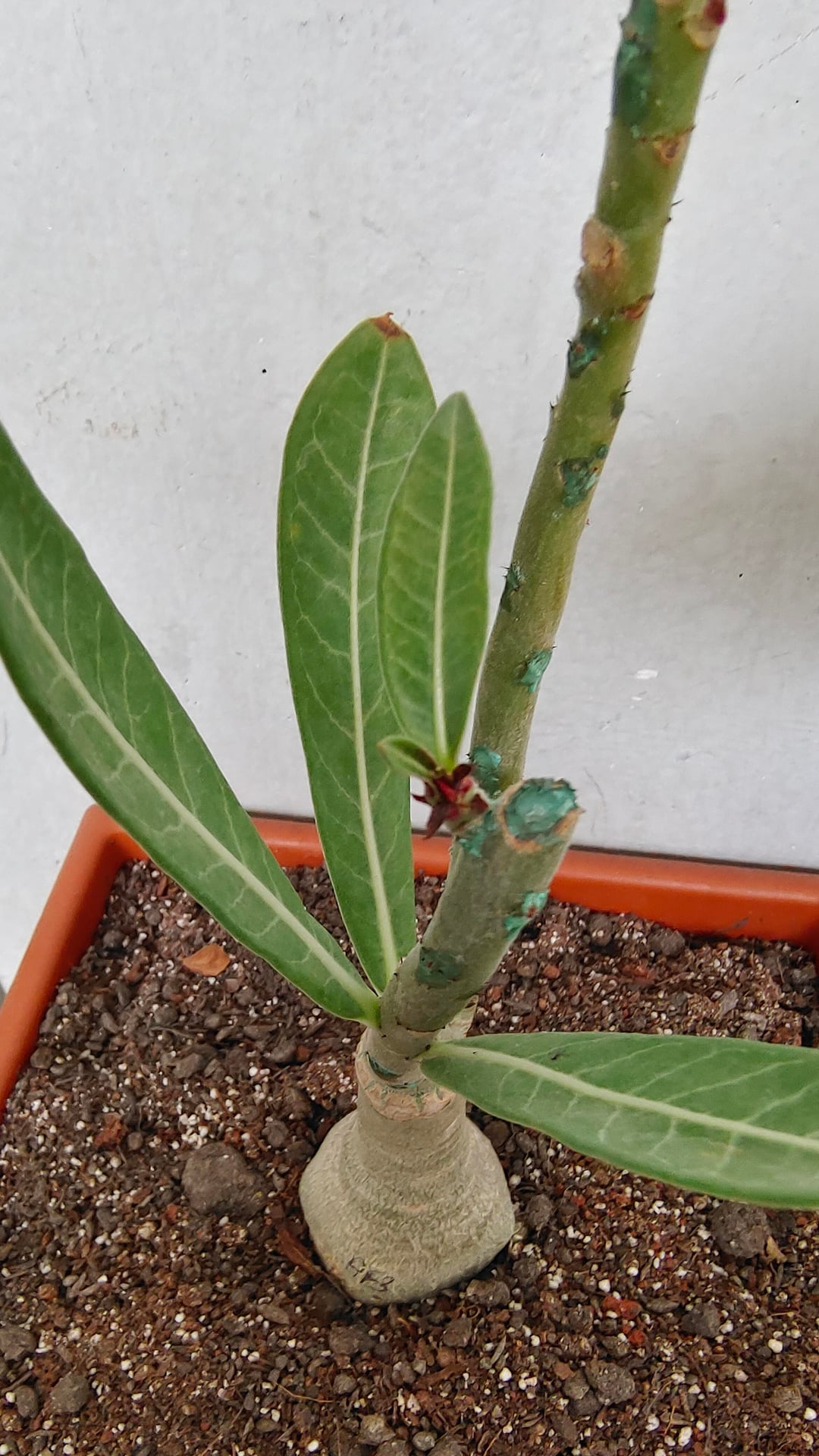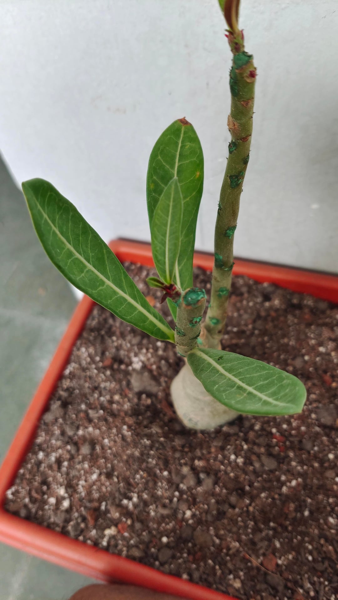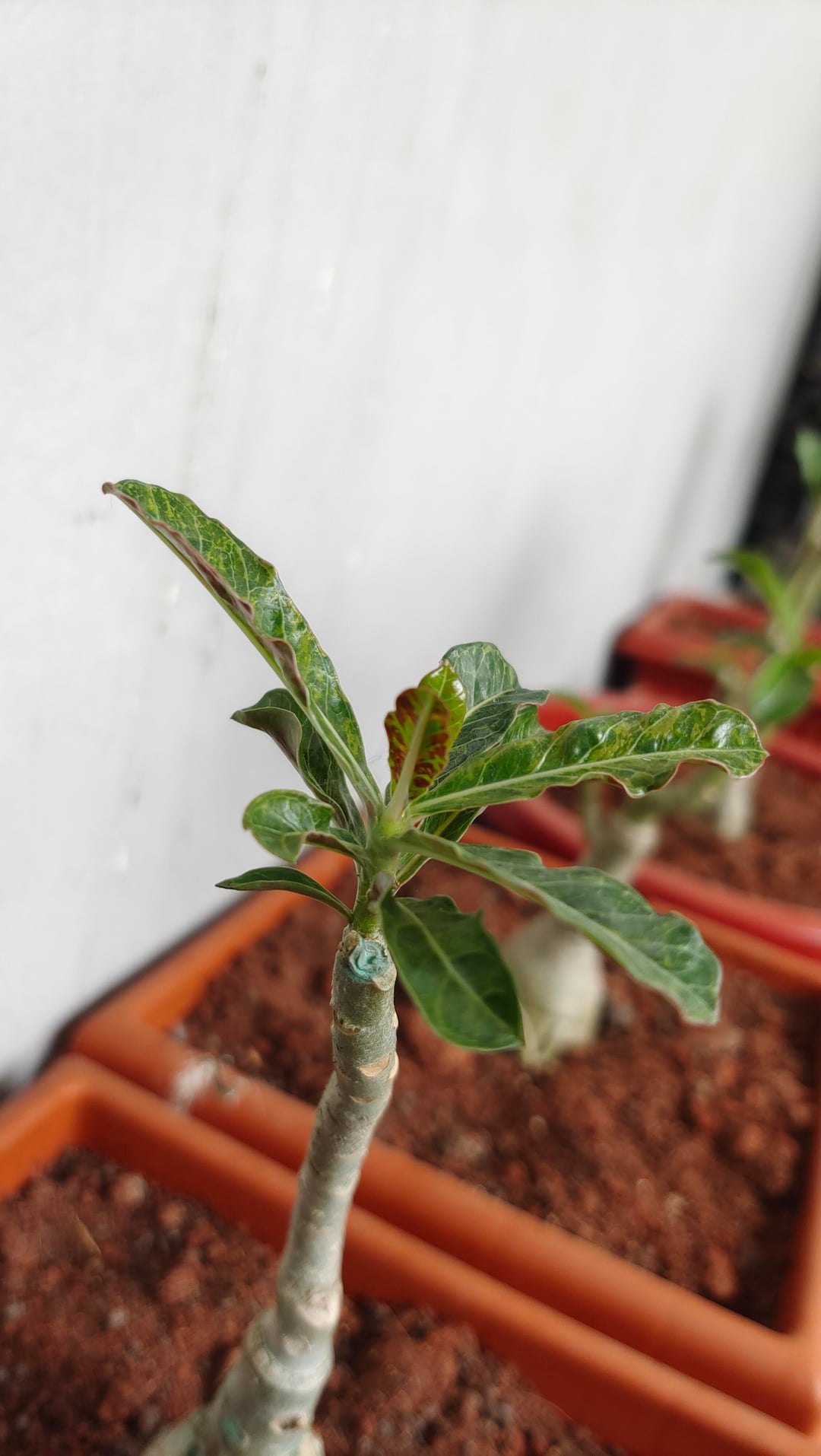 アデニウムの葉が紫や赤になってきて、成長しなくなってきました。購入してから植えて40日が経ちました。鉢植えにしたときは葉がありませんでした。しかし、これから成長する葉はすべて、緑ではなく赤や紫になるという問題を抱えています。中には育たずにベビーリーフのまま枯れてしまうものもあります。アデニウムの専門家が助けてくれますか?文脈としては、冬/モンスーン気候が続いているため、利用できる太陽光が非常に少なくなっています。水やりを大幅に減らして、もう31日間も水をやっていません。また、私は適度な湿度のある場所に住んでいます。