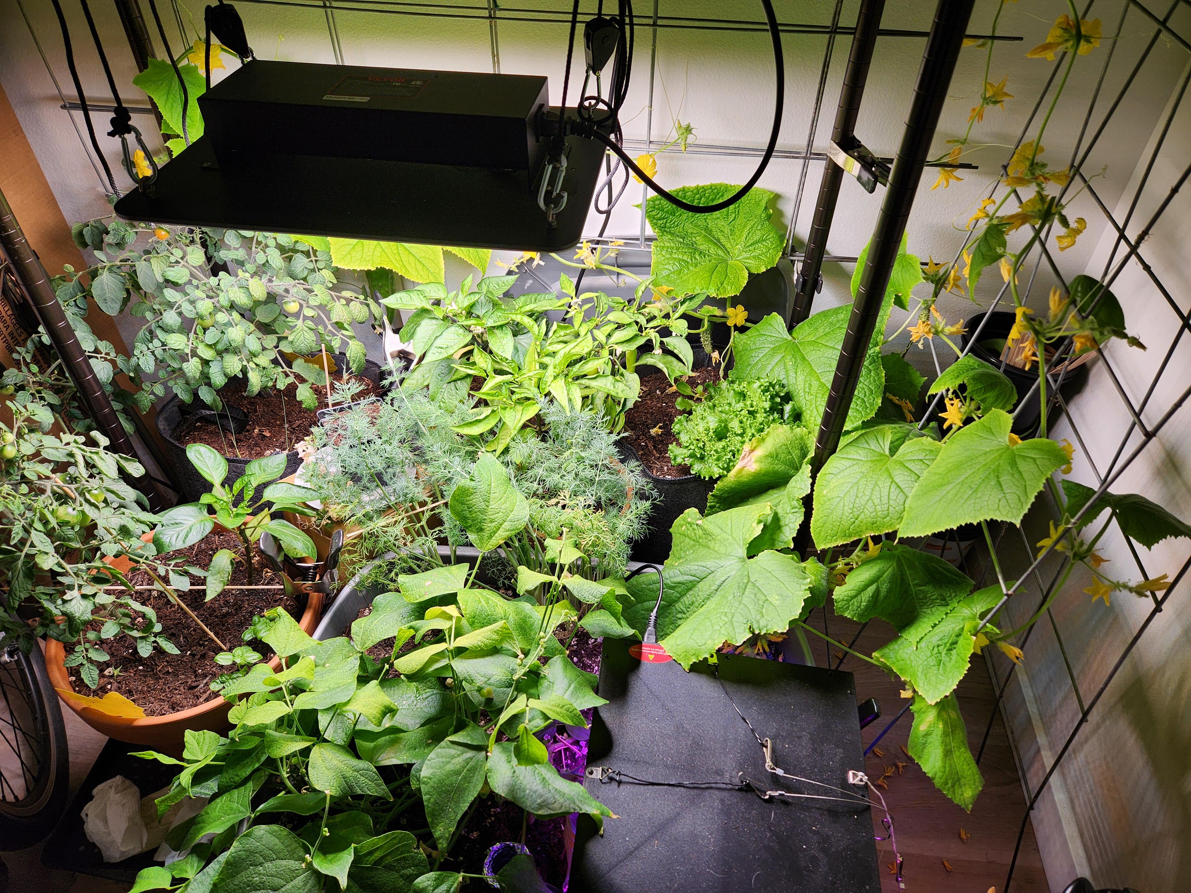 夏は室内で過ごすことに決め、トマト、ピーマン、豆、キュウリ、ほうれん草、レタス、ハーブなど、いくつかの植物を育てることができました。室内で他にどんな野菜を育てているのか、誰か意見や提案があるのか気になりました。あまりうまくいっていない点がいくつかありますので、ご協力いただければ幸いです。