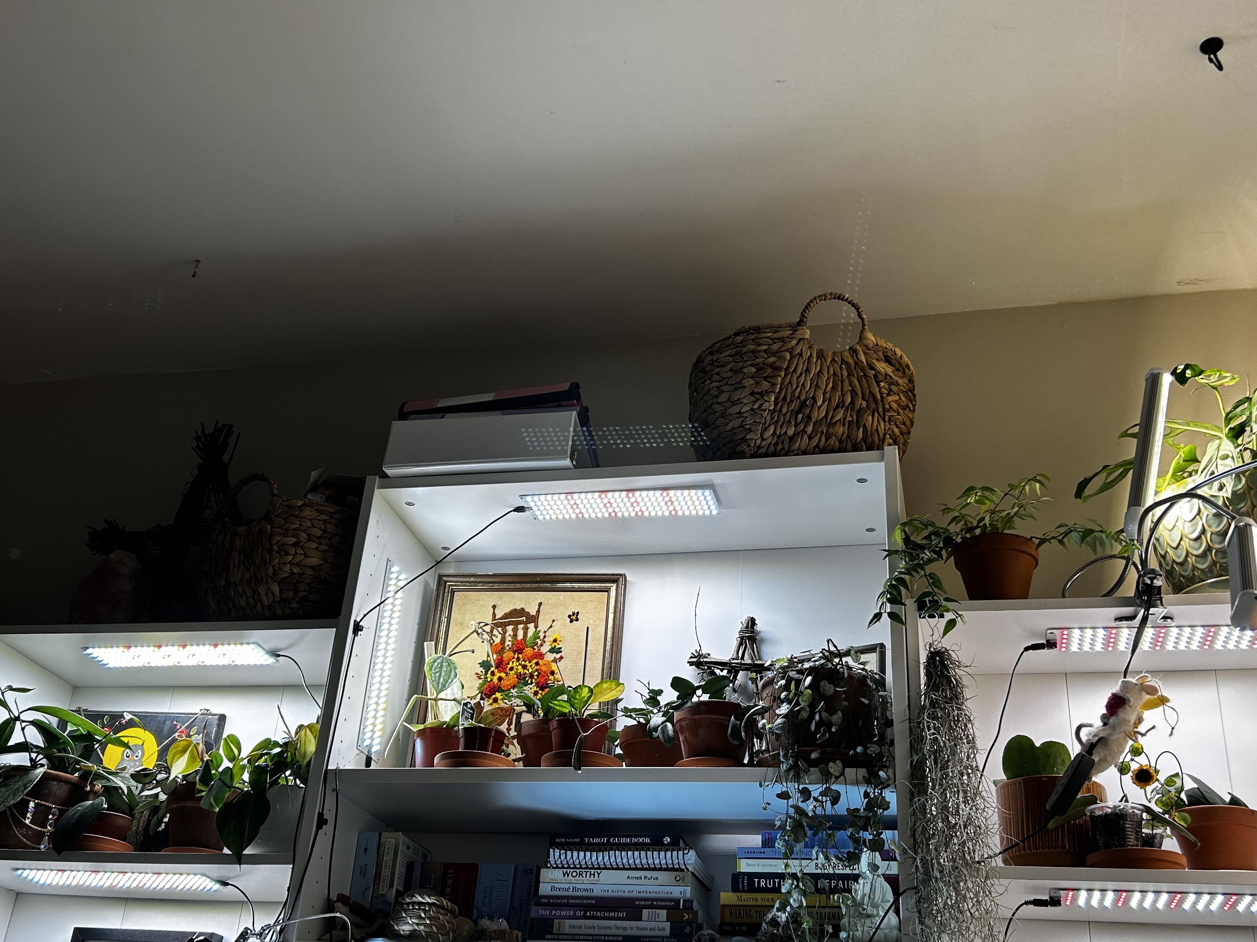 本棚の上部に適したライトを見つけるのに助けを探しています。できれば天井から吊るして、本棚の上部を植物のために使用できるようにする必要があります。
