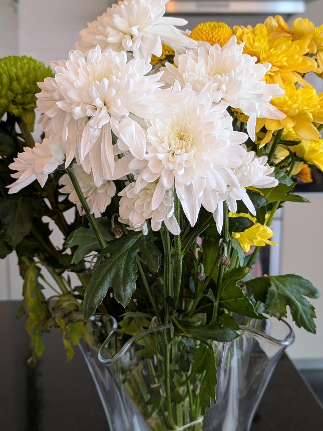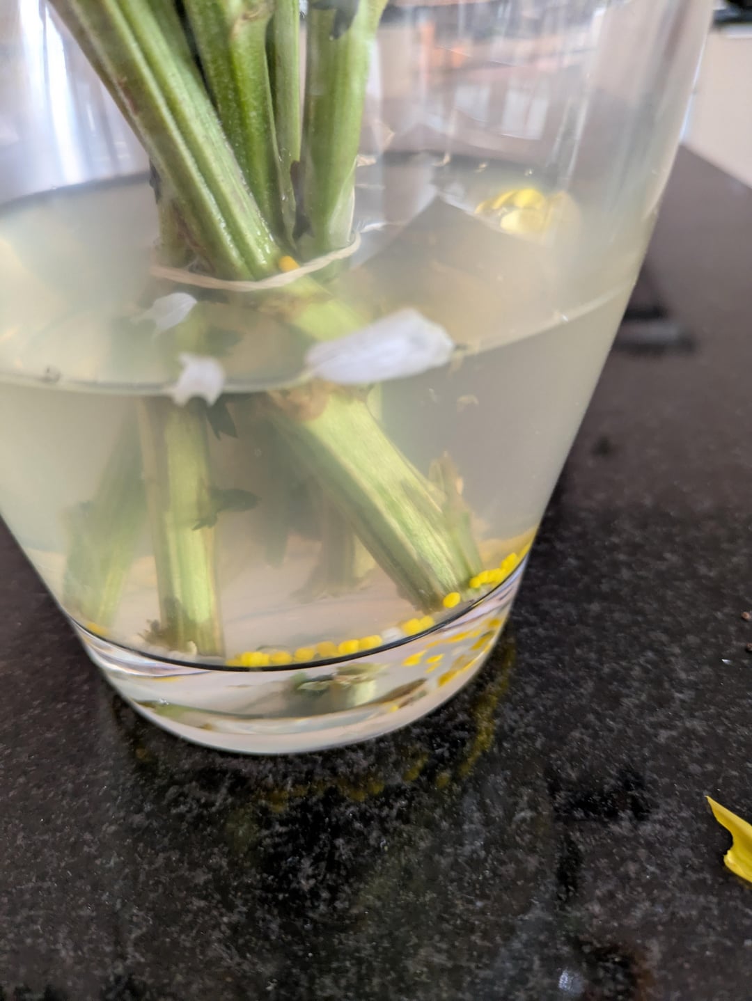 これらの切り花を一週間前に購入しました。最初は花の餌を入れた水に入れていましたが、3日前に水を変えました。昨日、彼らが黒、黄、白のボールを水の中や床に落とし始めていることに気づきました。小さな黒い点と黄色と白のボールは柔らかくてふわふわしています。これらは何ですか?