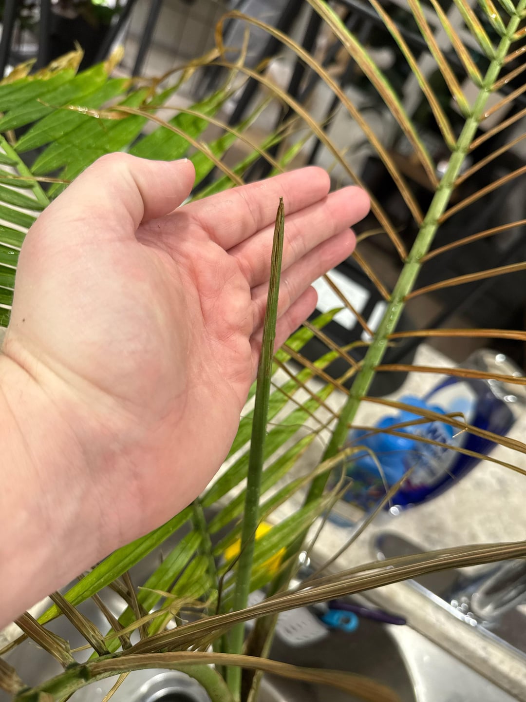 それで私はこの雄大な手のひらを持っているのですか?私は思う?私は9ヶ月ほど成長してきました、そしてそれは驚くべきことをしています!葉っぱ1枚から始めて、今では3歳になり、誇りに思っています!さて、最近葉先が茶色くなっていることに気づき、さらに調べてみると葉の茎に黒い斑点が…。慌てて根こそぎ引き抜いてシャワーを浴びさせましたが、原因はわかりません。インディアナ州以外の天気?でも、ドアの近くにはありません…。そうですね…害虫はいませんでしたし、最初から幸せでした。室内に置いて、バリーナから約5フィート離れたところに、残りの植物のすぐ横に加湿器を置き、10インチの光を育てています…正気を失ってすべて切り落とす前に、誰か手伝ってくれませんか?中心に出てくる新しい葉さえ茶色くなっています!!?それは私のOGの最初の自分で購入した植物であり、枯れたくない!!!:(