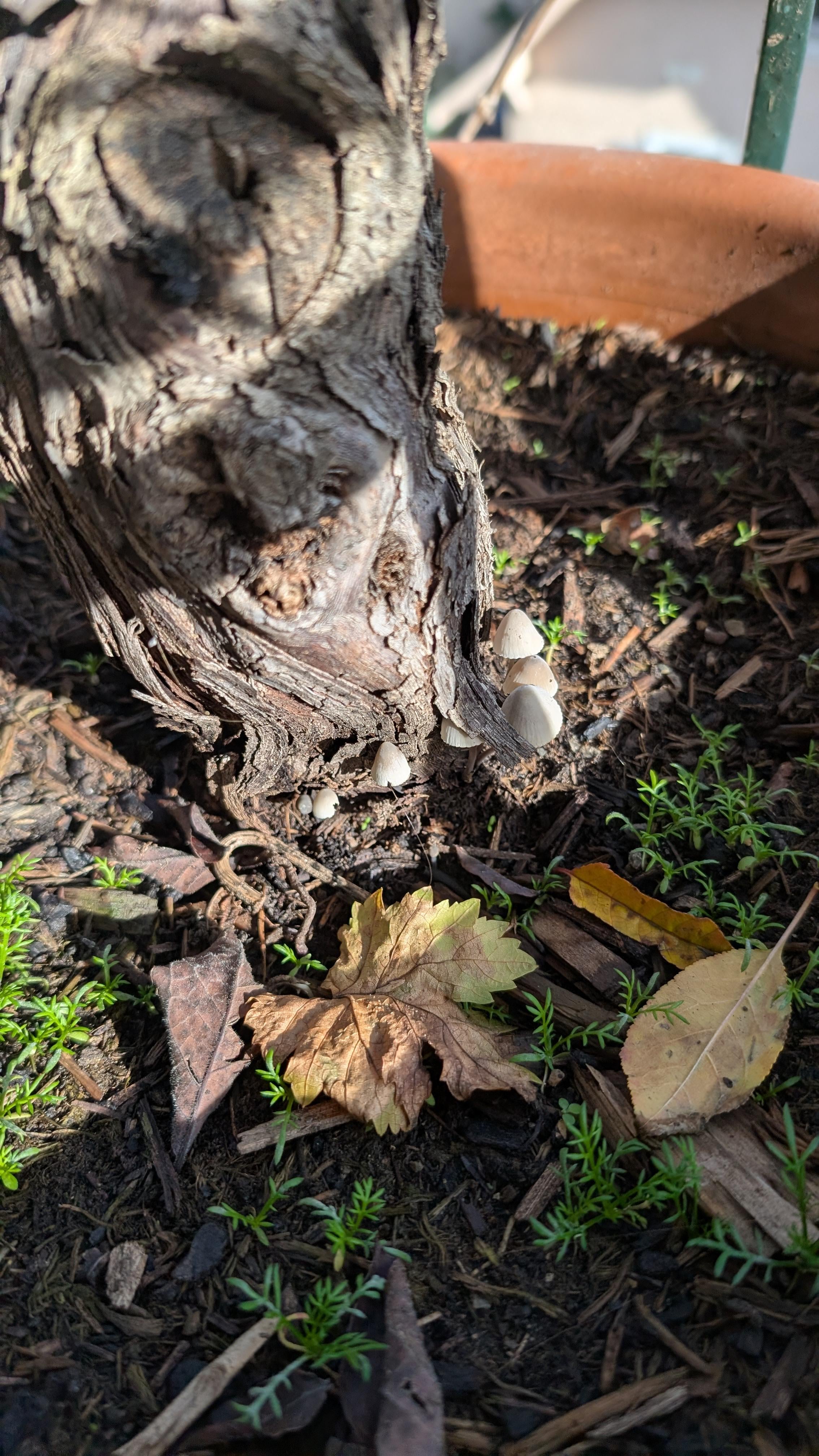 おい ! 5年前から鉢につるの木を植えています。最近いくつかのキノコが発芽しました(写真を参照)。心配する必要がありますか、それとも何か対処すべきことがありますか?