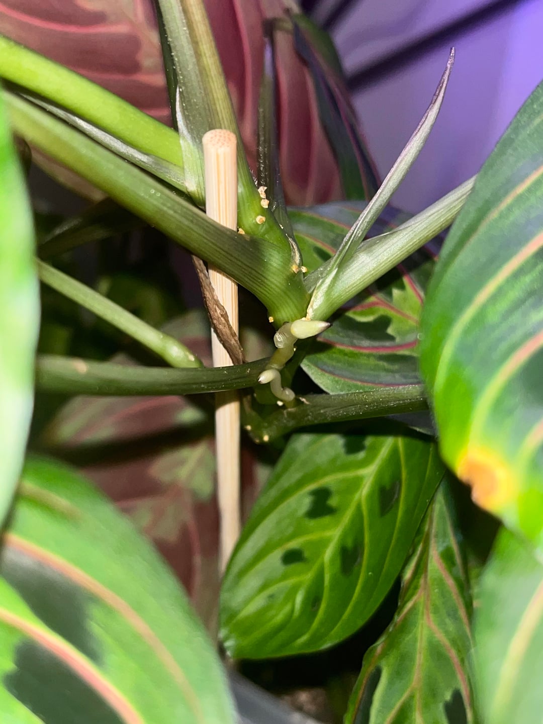 やあ、植物の友達!私の赤い静脈のマランタは驚くほど成長しており、いくつかの花も咲かせてくれました。これらは数日前に現れましたが、私にはそれが何であるかわかりません。決して花芽や新葉ではありません。これを見たことがありますか?まるで茎から生えている緑色の虫のように見えます。よろしくお願いします!