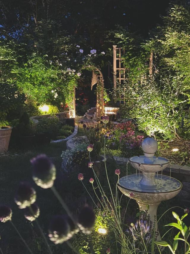 夜の照明がおとぎ話から飛び出してきたような庭園を演出します
