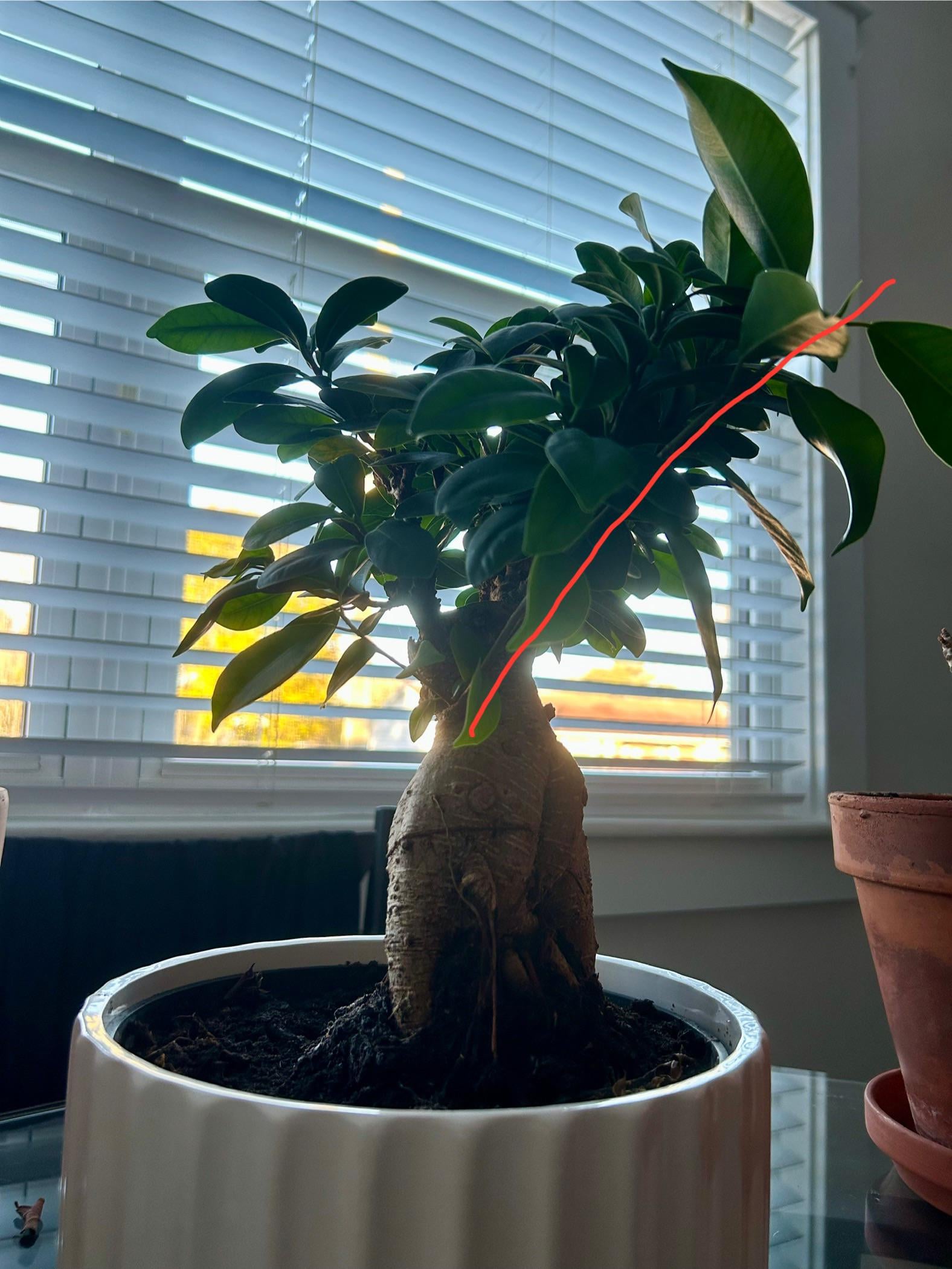 盆栽の形を保つために、赤い線に沿った長いシュートをどこでトリミングしますか?