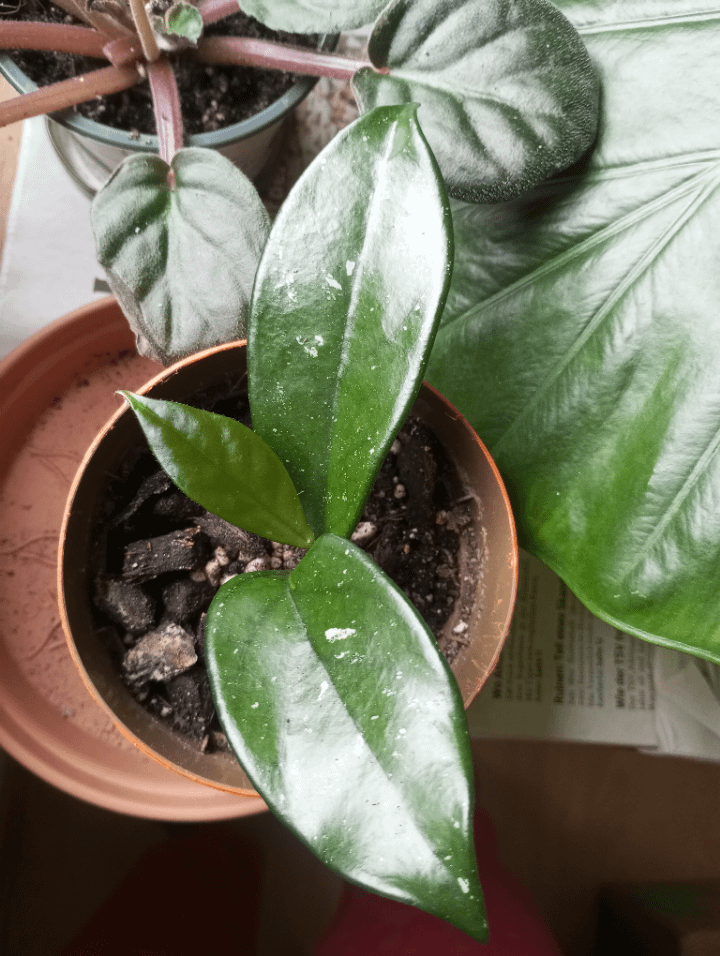 初めてのホヤ支柱に最初の葉が生えてきて、しっかり成長しています🍃