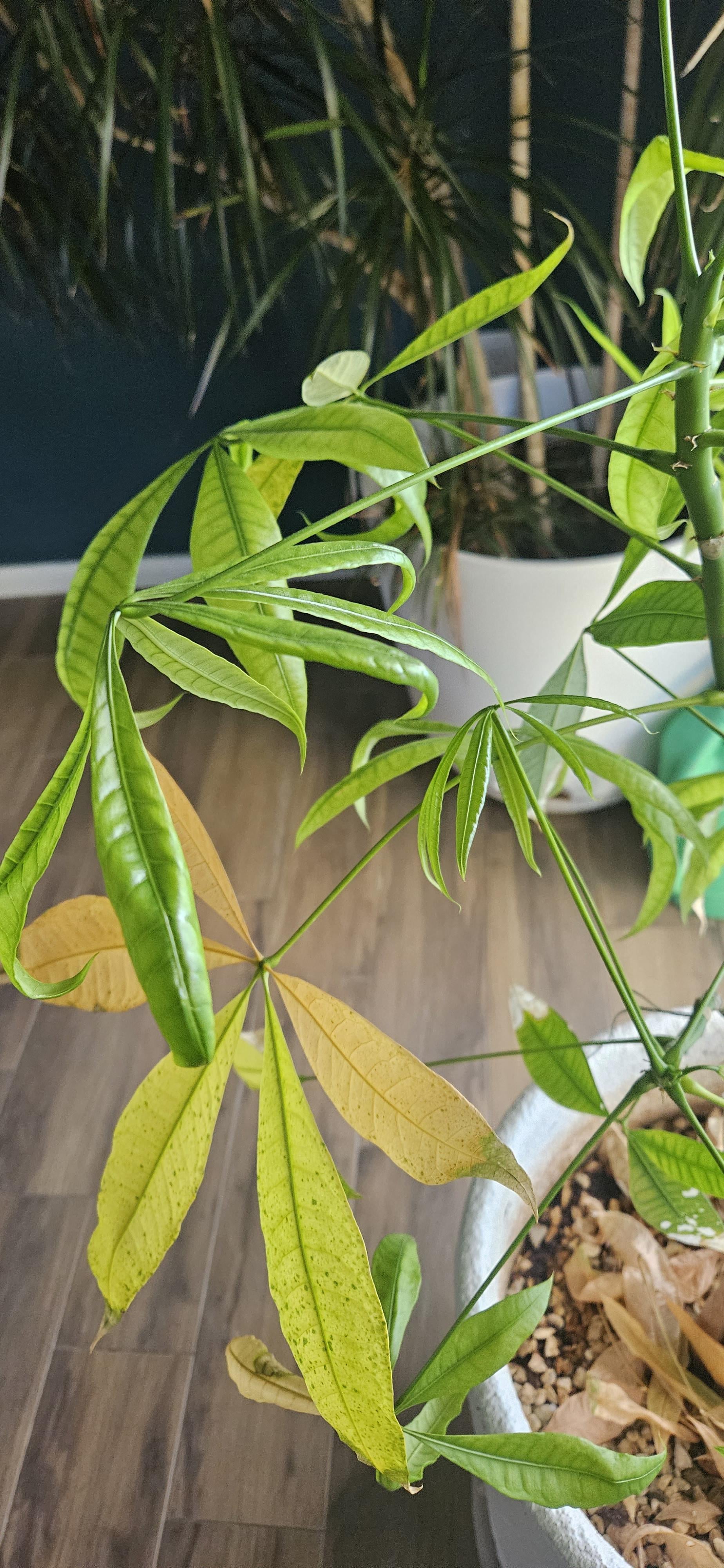 この植物はいつも南向きの窓辺でよく育ちました。最近、葉が黄色くなり、落ち始めました。また、残りの植物の葉が薄緑色に見えることにも気づきました。光が異なる別のエリアに移動しましたが、違いはありませんでした。ご提案をいただければ幸いです