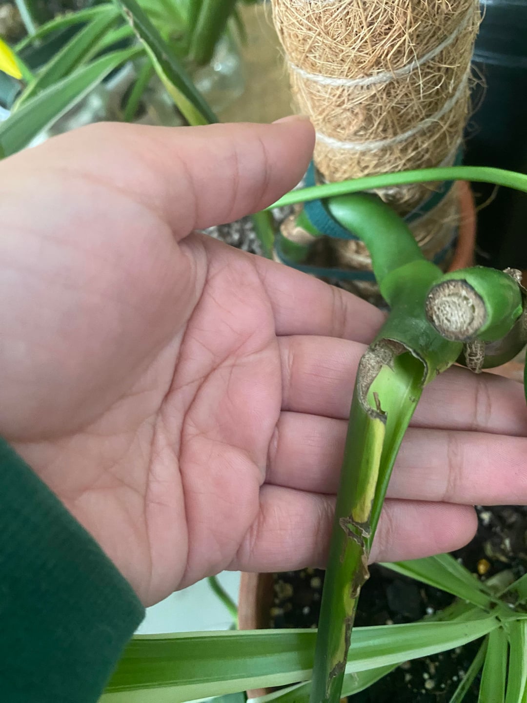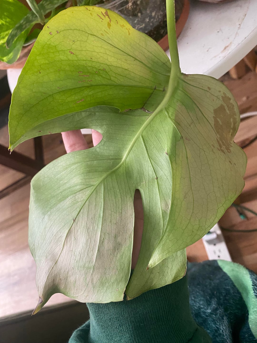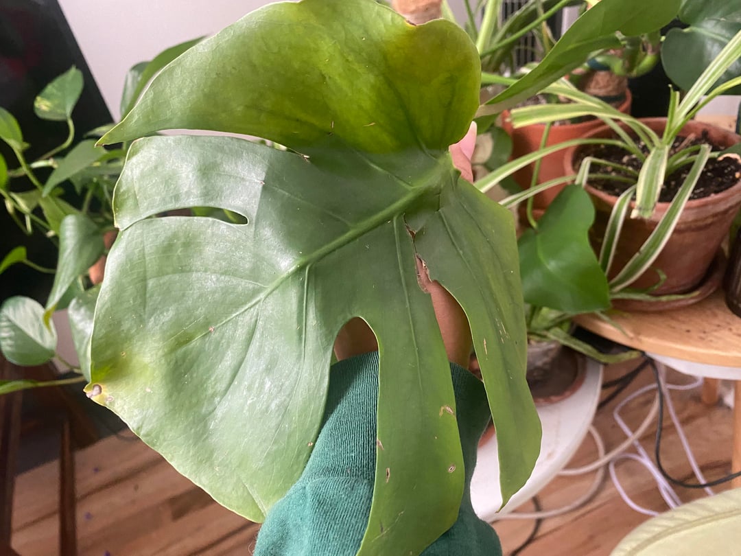 私のフィドルリーフイチジクの葉はほこりっぽいですが、何かが欠けていないかどうかを確認するためにそこに残しました。最近、北向きの窓から南向きの窓に移したのですが、葉がかなり日焼けしてしまいました。今は日焼け以上のものが心配です。もう1枚の葉は、最近植え替えたモンステラのもので、葉は茎のところで折れていますが、植物がすべての栄養素を吸収できるようにそのままにしておきます。しかし、それ以上のものなのかも疑問に思っています。私はアザミウマを扱ったことはありませんが、これらのサブレディットでよく見かけて、今では被害妄想になっています。
