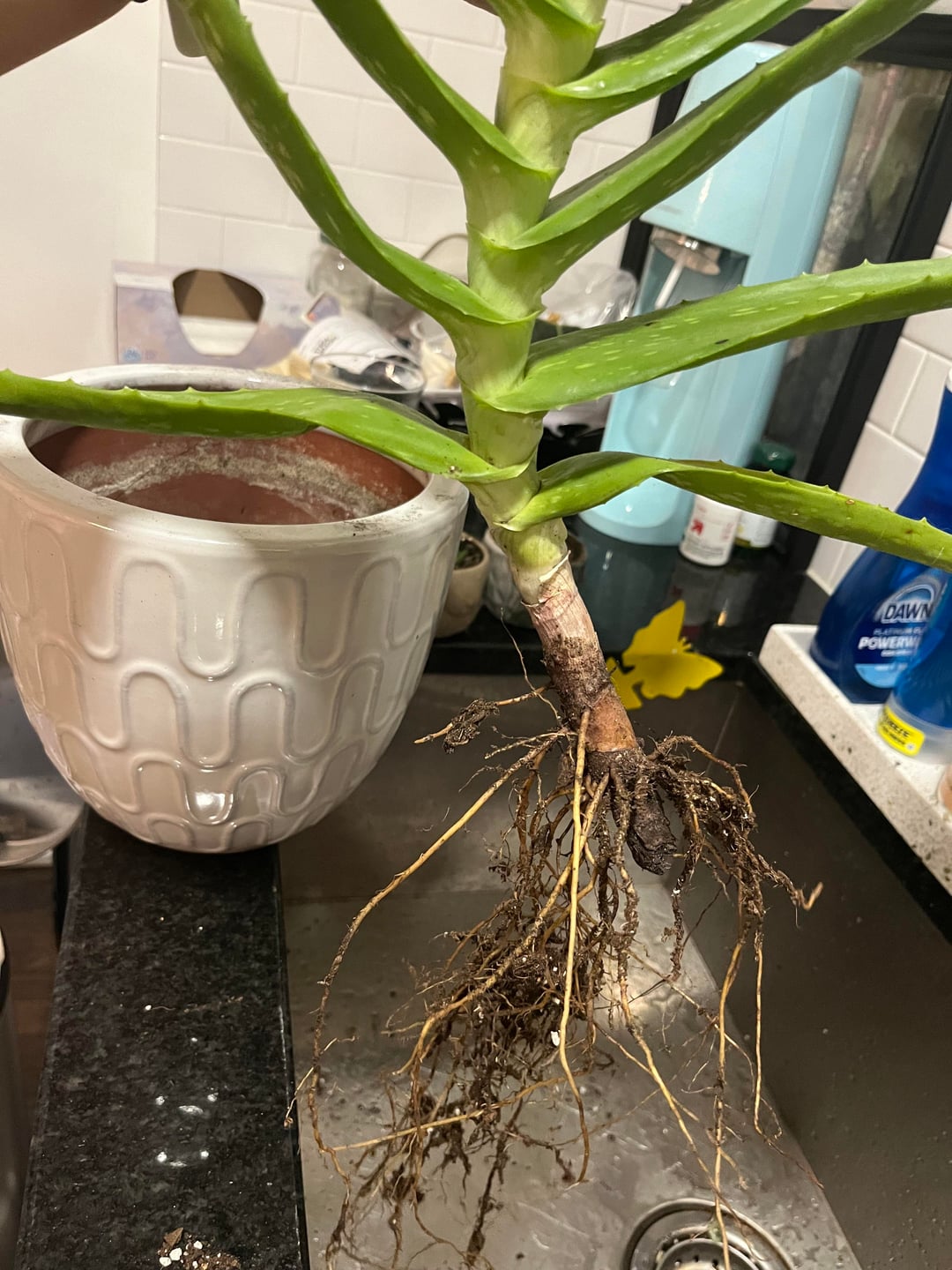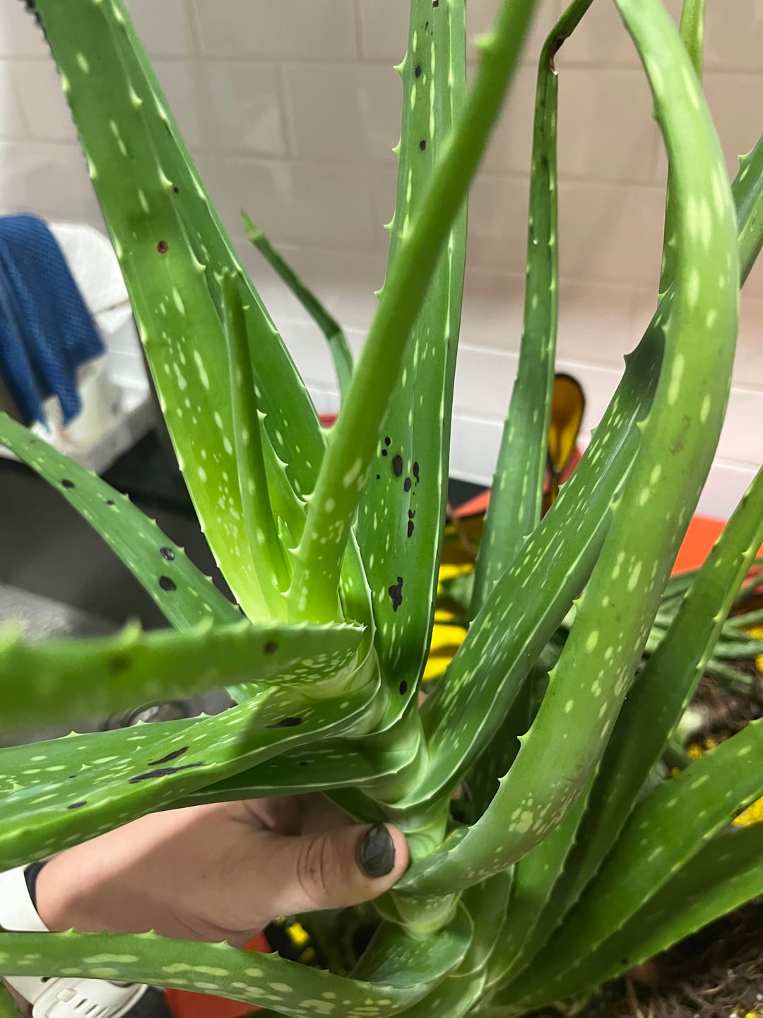 私はこのアロエベラの植物をおそらく10年間飼っています。成長して成長し、定期的に子を産みます。しかし、突然、真菌か細菌と思われる黒い斑点が増えてきました。茎も全然ふにゃふにゃしていないので根腐れはしていないようです。 影響を受けた葉を取り除く必要があると思いますが、ご覧のとおり、それは植物の大きな塊になります。本当にこれをすべて剪定して、無神経のままにしてから植え直すつもりですか?それを捨てますか?他に何か提案はありますか?