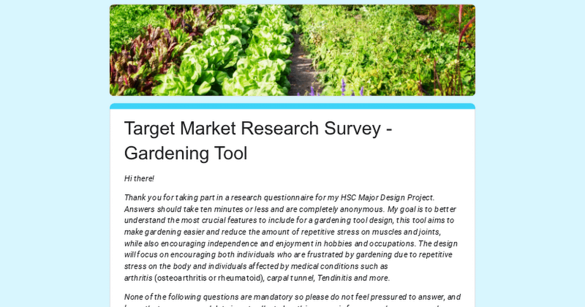 やぁ、庭師さん!私は現在、12 年目の主要な設計作業に取り組んでいます。時間を割いて簡単なアンケートにご回答いただけると幸いです。結果は私の設計ポートフォリオに使用し、最終製品の機能を改善する予定です。すべての質問は匿名で行われ、個人情報は収集されません。
