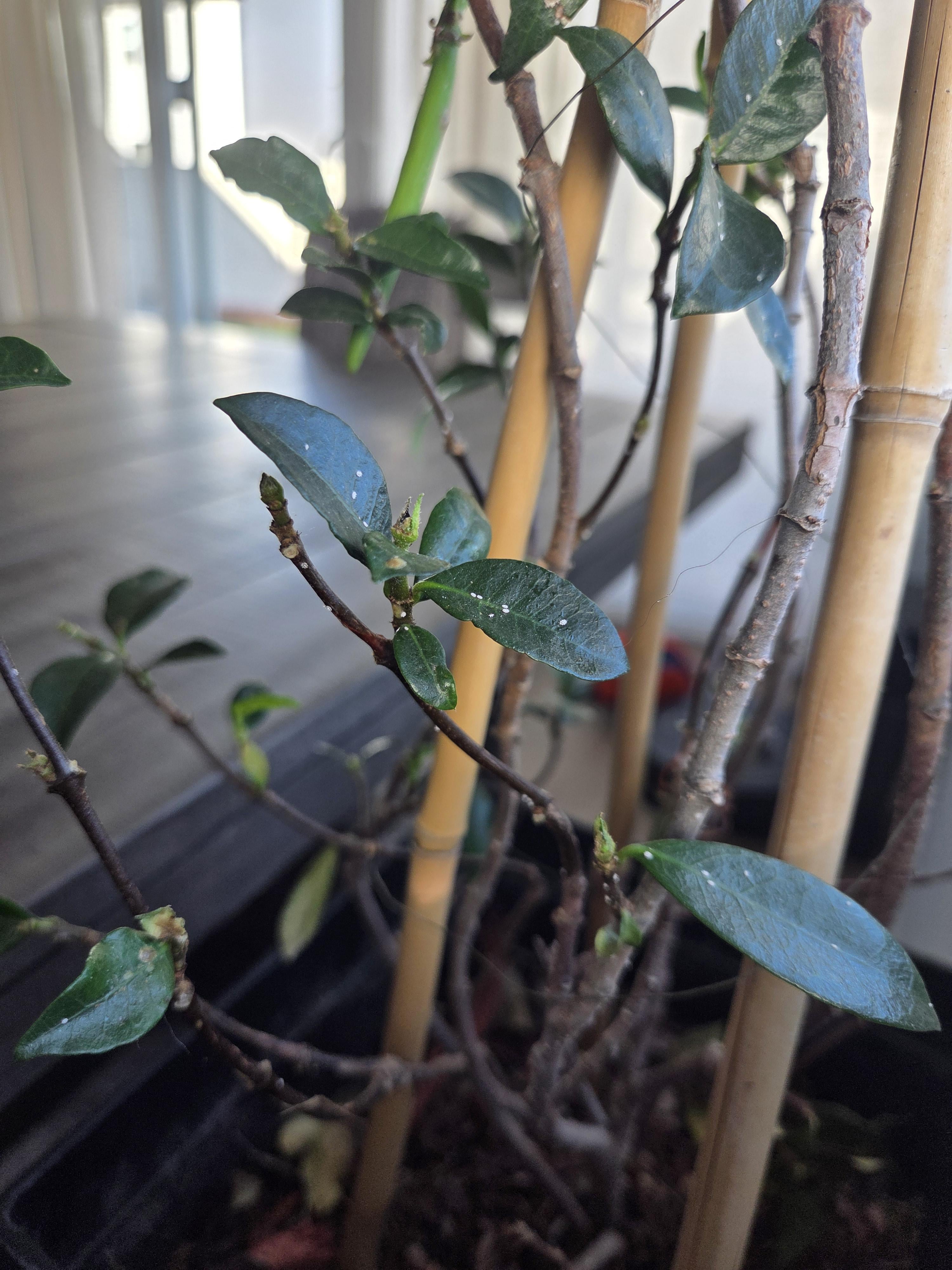 寒くなり始めたときにジャスミンを室内に取り込んだところ、突然茎や葉全体に白い斑点があることに気づきました。誰かこれが何なのか、そしてどのように治療するのか教えていただけますか?ありがとう!