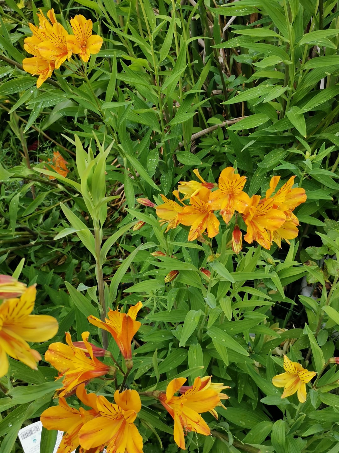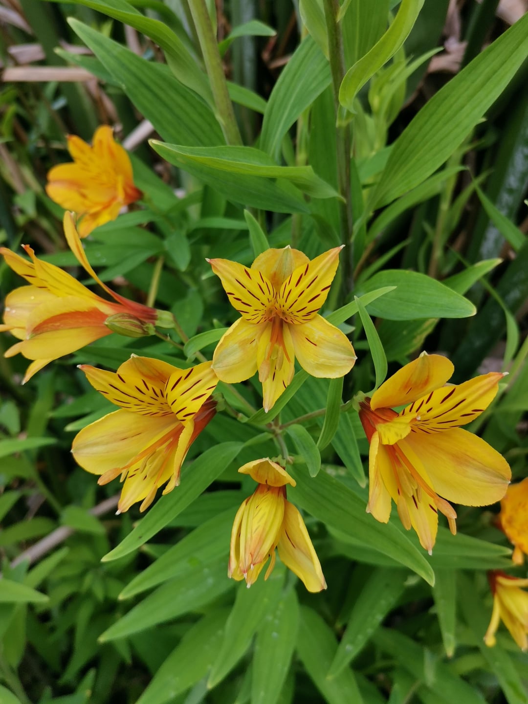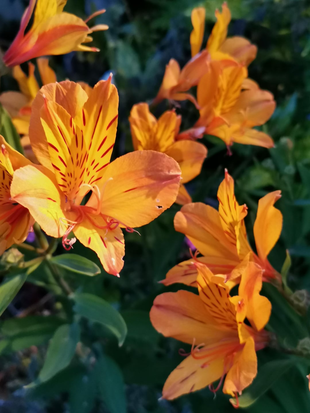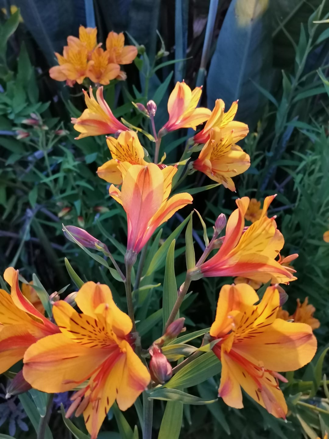 夕方に防犯灯に照らされる、豪華な古い品種の黄金色のアルストロメリア(最後の 2 枚の写真)。