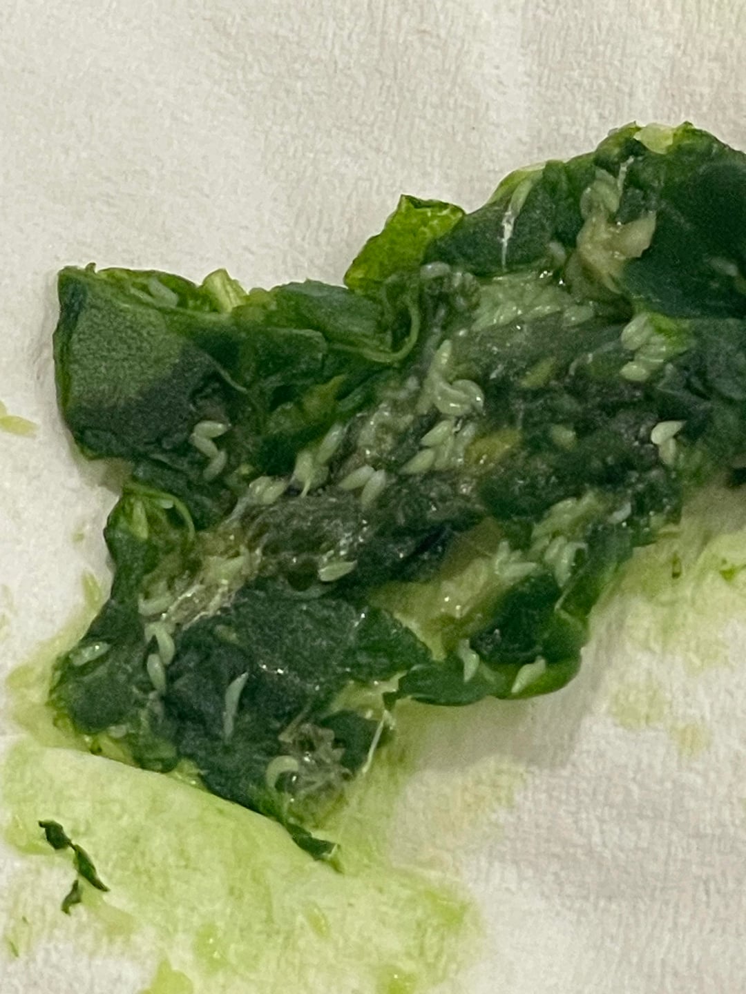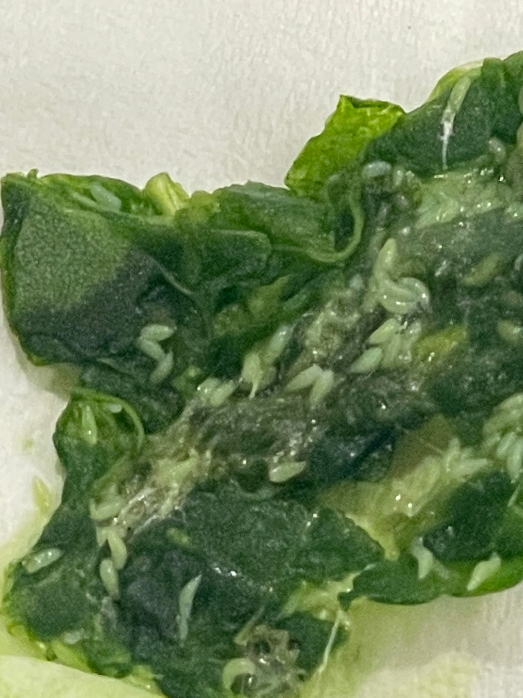 ルッコラをきれいに洗ったと思って、大きくかじって、グニグニとした感触を感じました…すぐに吐き出して、これを見つけました 😭 カリフォルニア州セントラルバレー。アブラムシの卵??よくわかりません 🥲