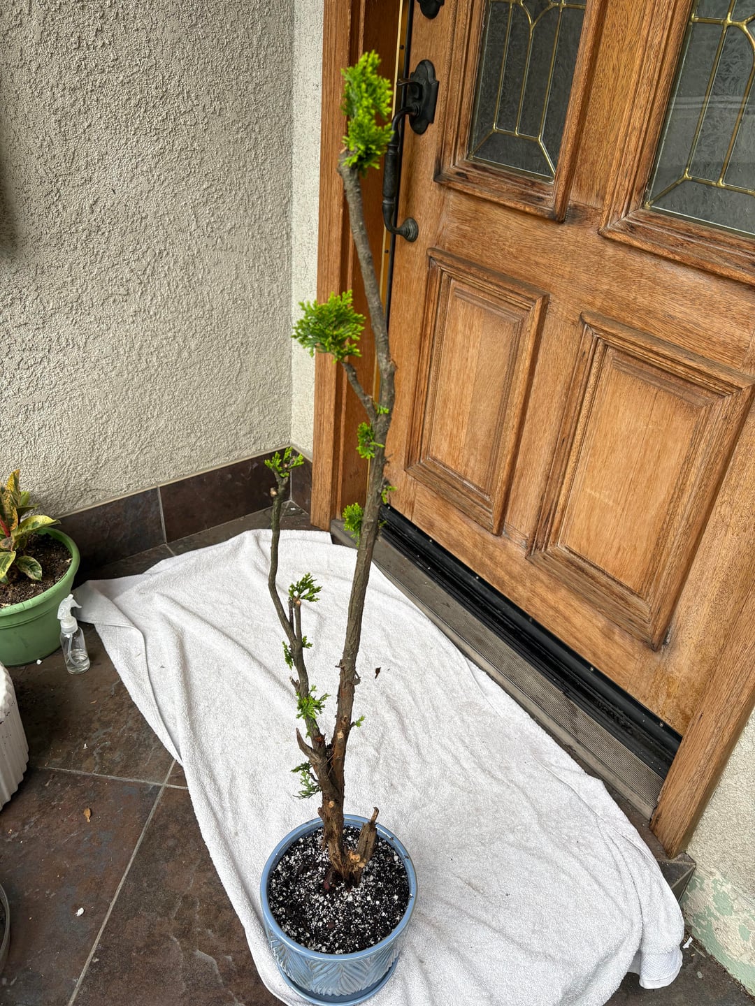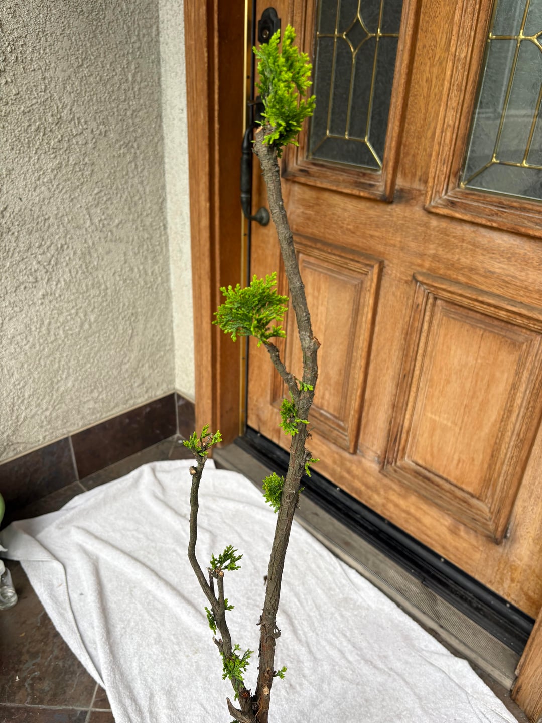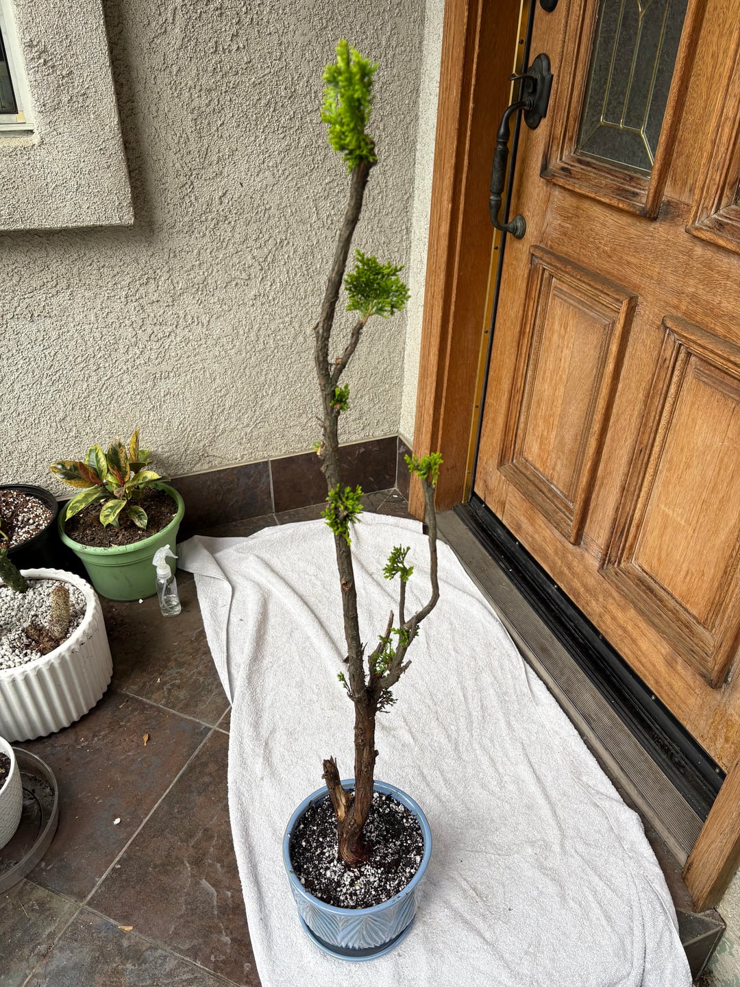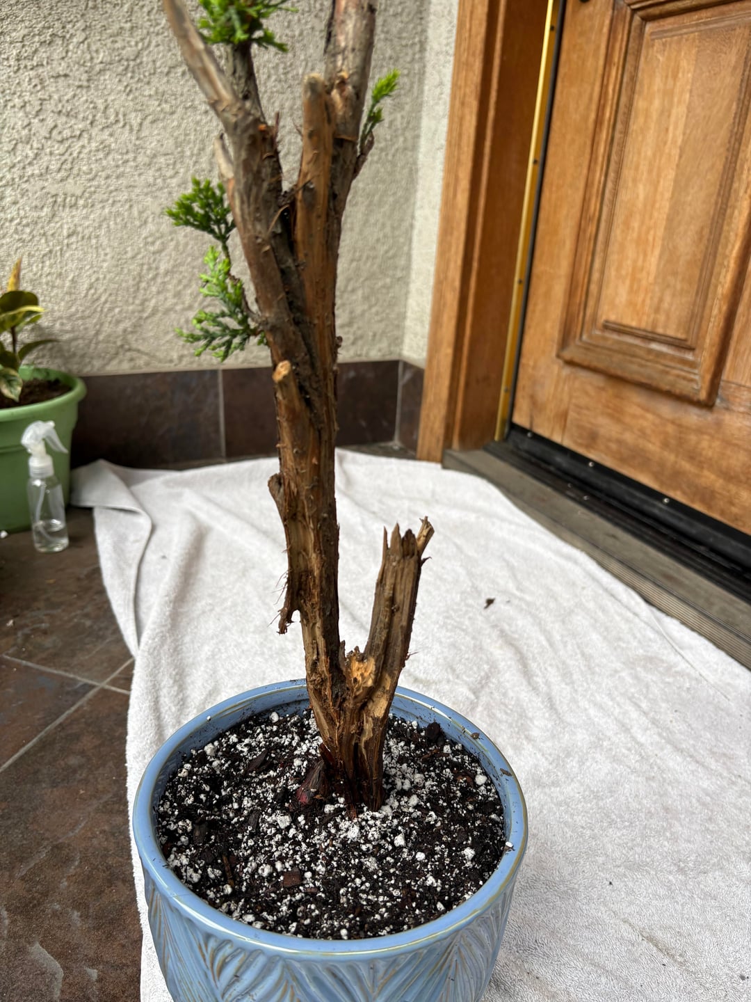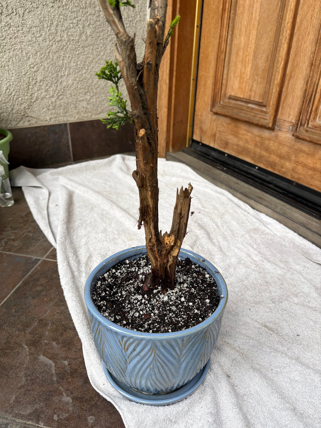 このジュニパー🌱(ジュニパーだと思う)を地面から引き抜いて、小さな鉢に植えました。 枯れ枝を切り落とし、太い根元の枝を切り、元気な小さな根だけを残しました。 この植物が鉢の中で生き残れば、私は自分をアマチュアの観葉植物鉢植えの専門家であると考えるつもりです。 何かアドバイスはありますか?植物の高さを低くしたほうがいいでしょうか?