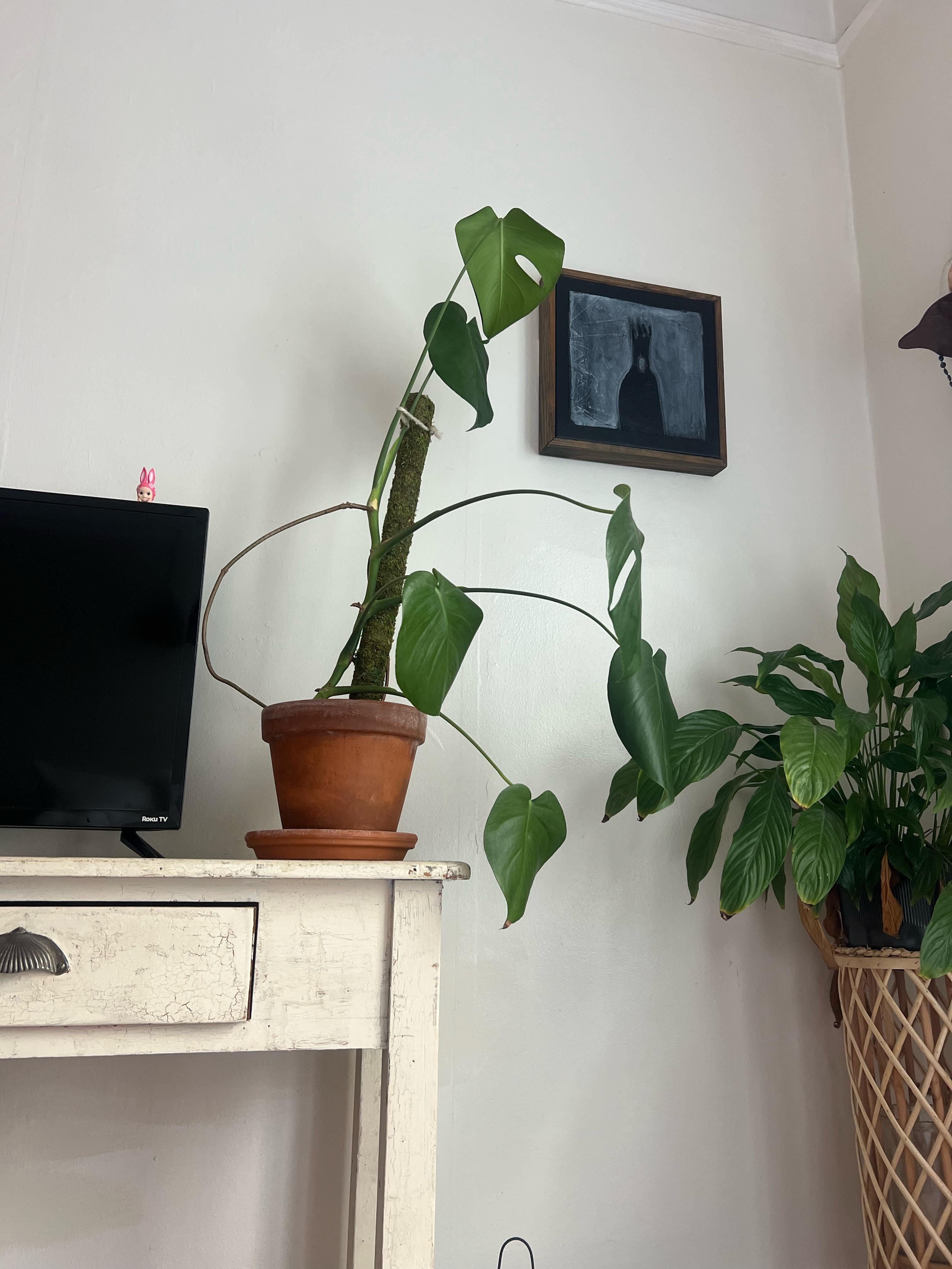 誰かが私のモンステラを助けるために何をすべきか教えてもらえますか?彼女は約5歳ですが、実際に大きくなり始めたのはここ2年です。この苔スティックを彼女の鉢に追加しましたが、それ以来、彼女は落ち続けます。