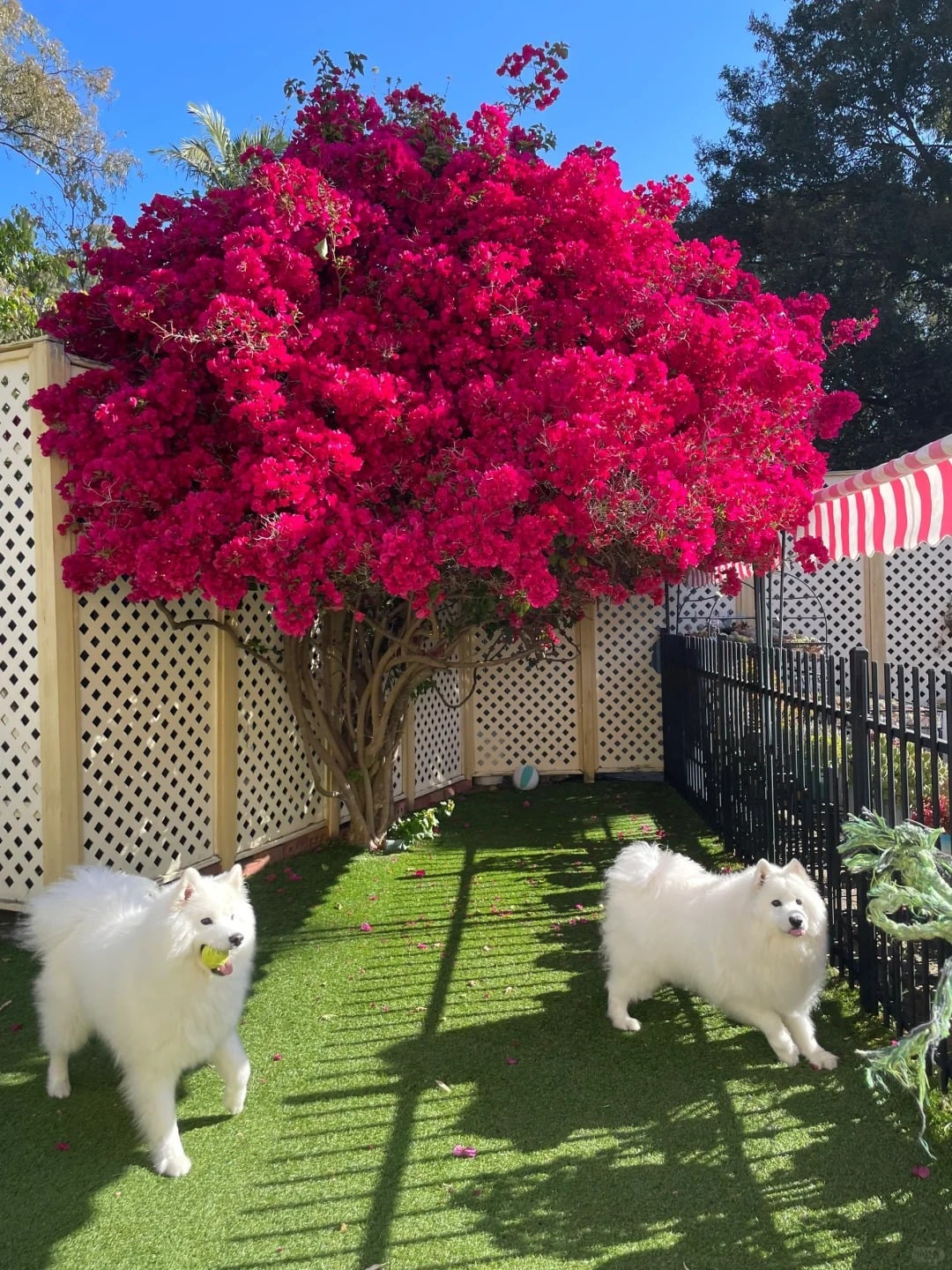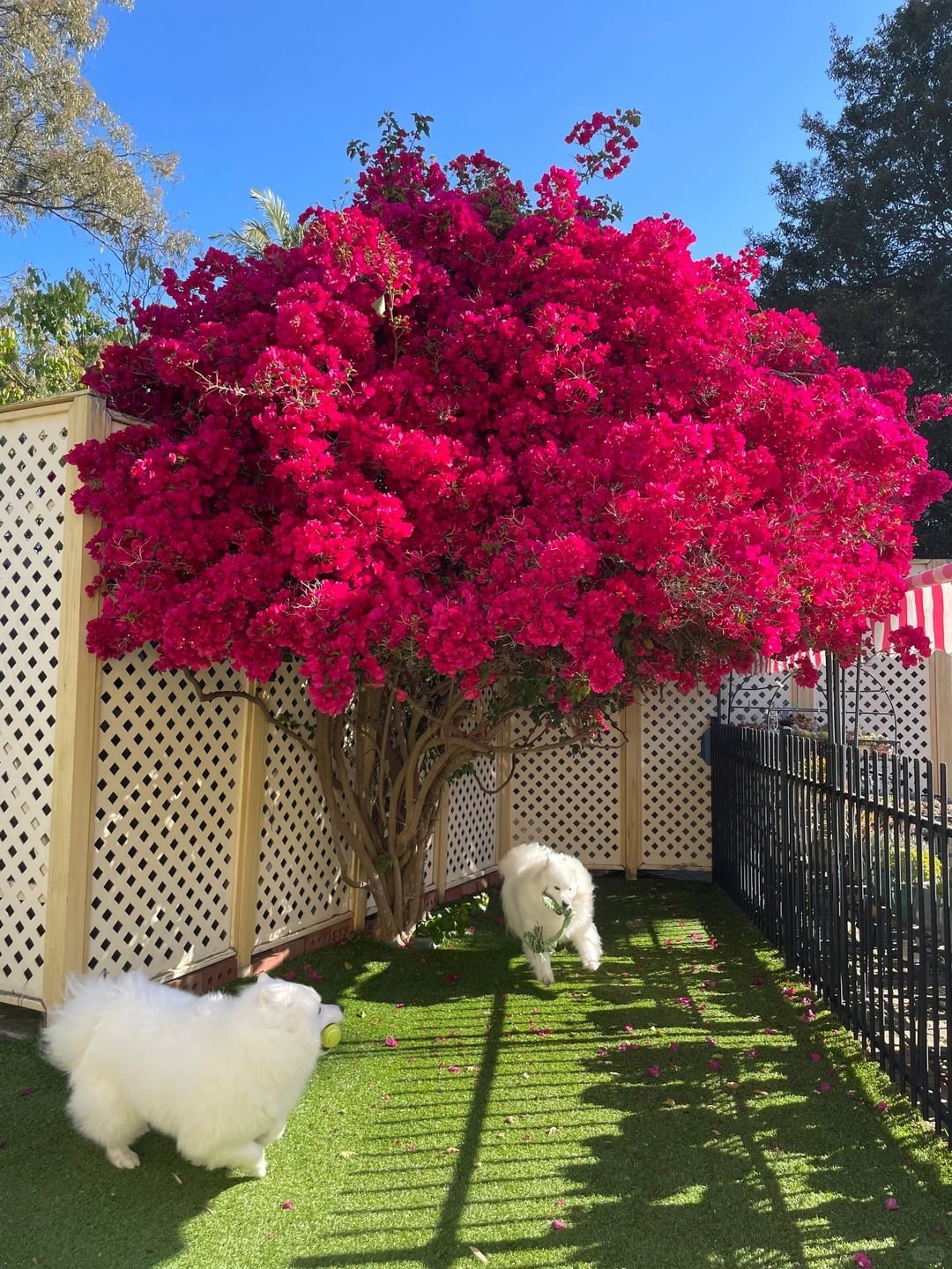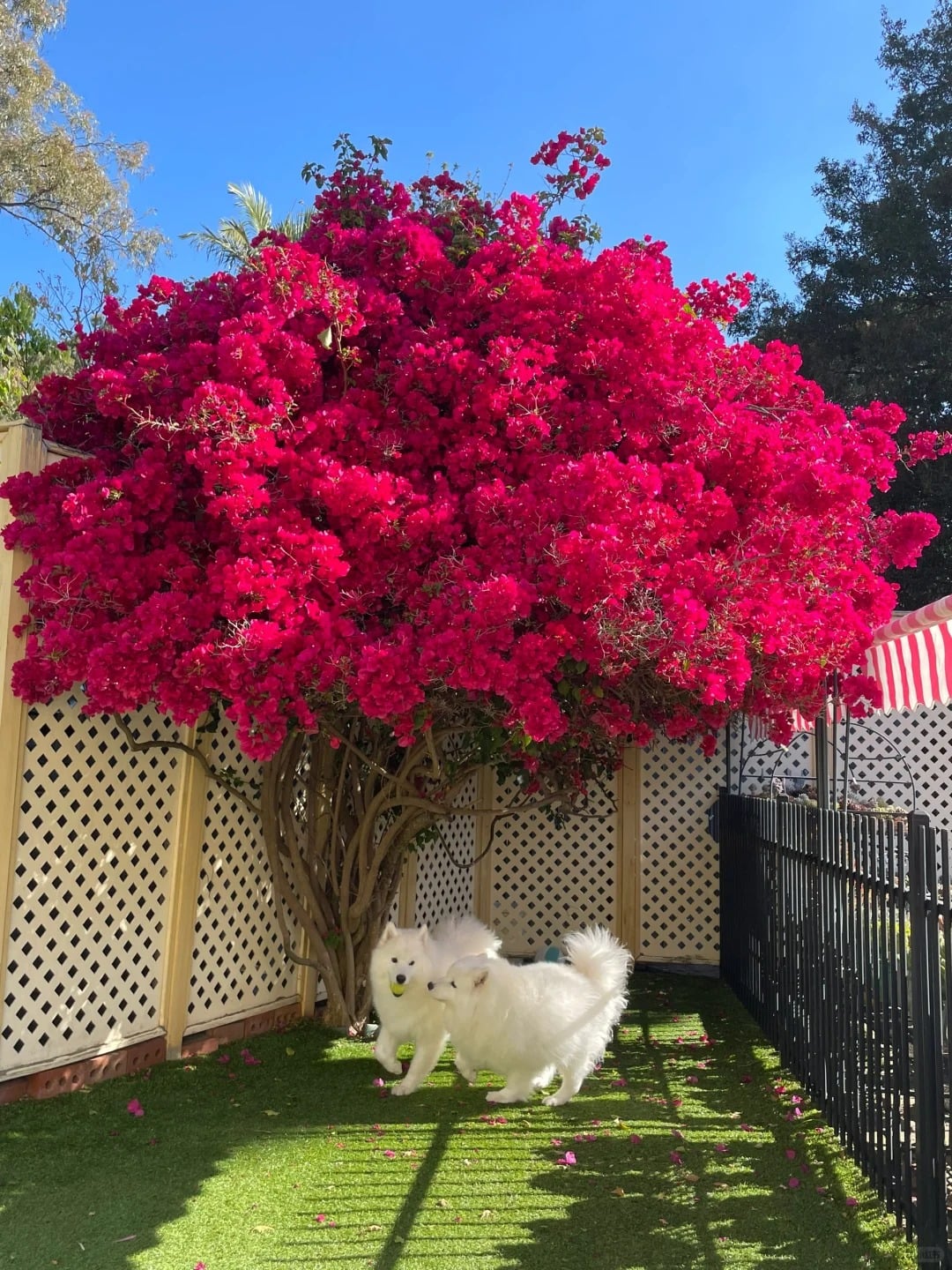 我が家のブーゲンビリアは満開で、ふわふわの仲間2人がそれを最大限に楽しんでいます。ここは彼らが遊んだりくつろいだりするのに最適な場所になっています。鮮やかな赤い花と白い毛皮のコントラストは純粋な喜びだと思います。これがあなたの毎日に少しの喜びをもたらすことを願っています!