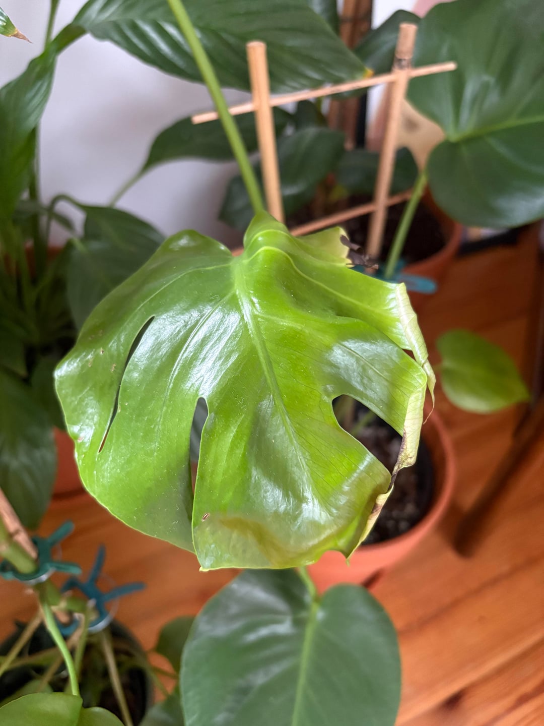 この葉の成長は本当にゆっくりで、いつも少しずれているように見えました。ようやくほぼ完全に解けたとき、左側の部分が茶色くなっていることに気づきました。原因は何だったのでしょうか。また、モンステラに最適な条件を与えて、健康で大きな葉をより早く成長させるにはどうすればよいでしょうか?