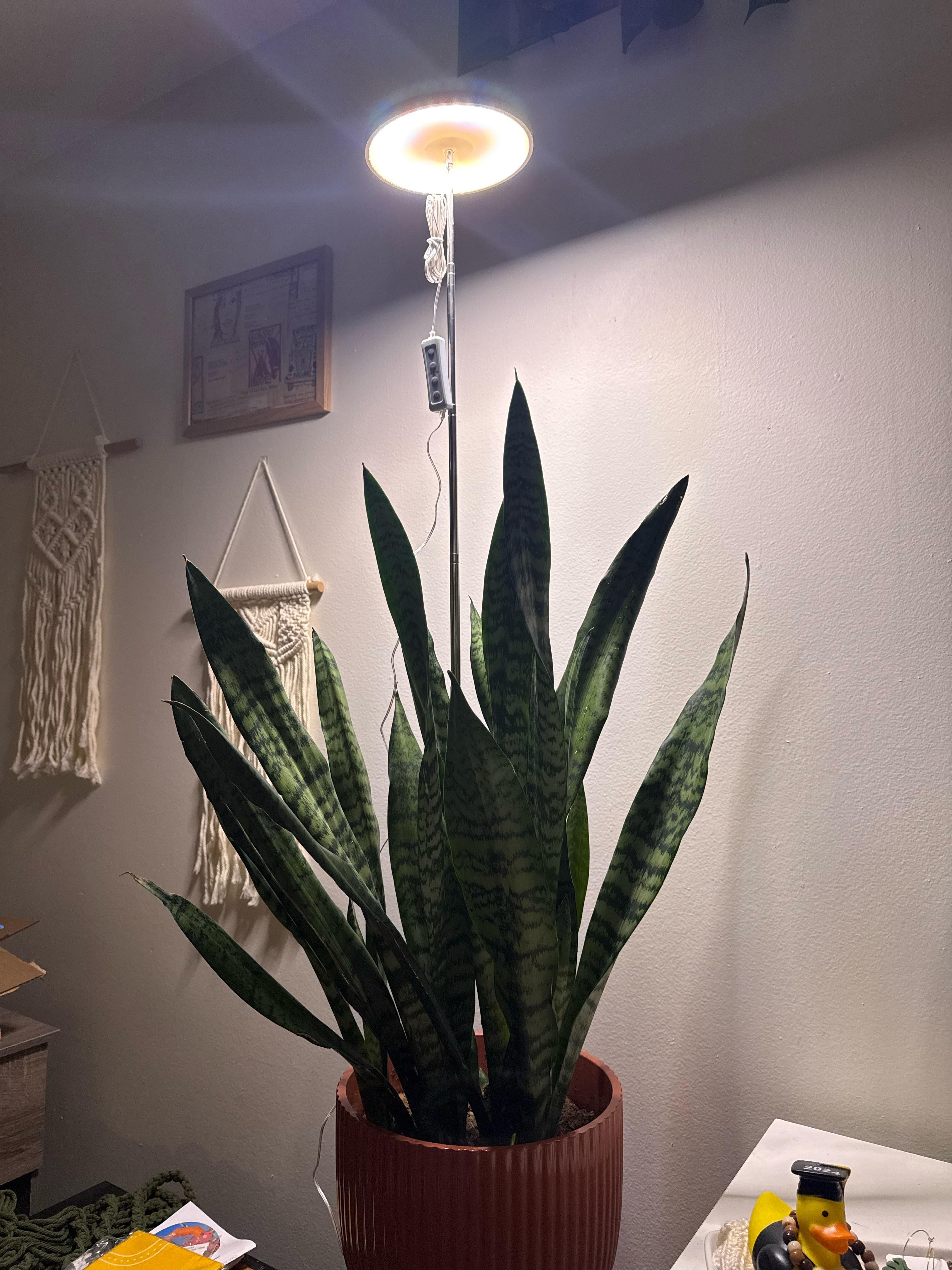 このヘビ植物を地下室に移動します。この植物育成ライトは適切な場所に設置されていますか?拡張可能なので、必要に応じてさらに上げることができます。光を斜めに当てるのに適した場所がありません。