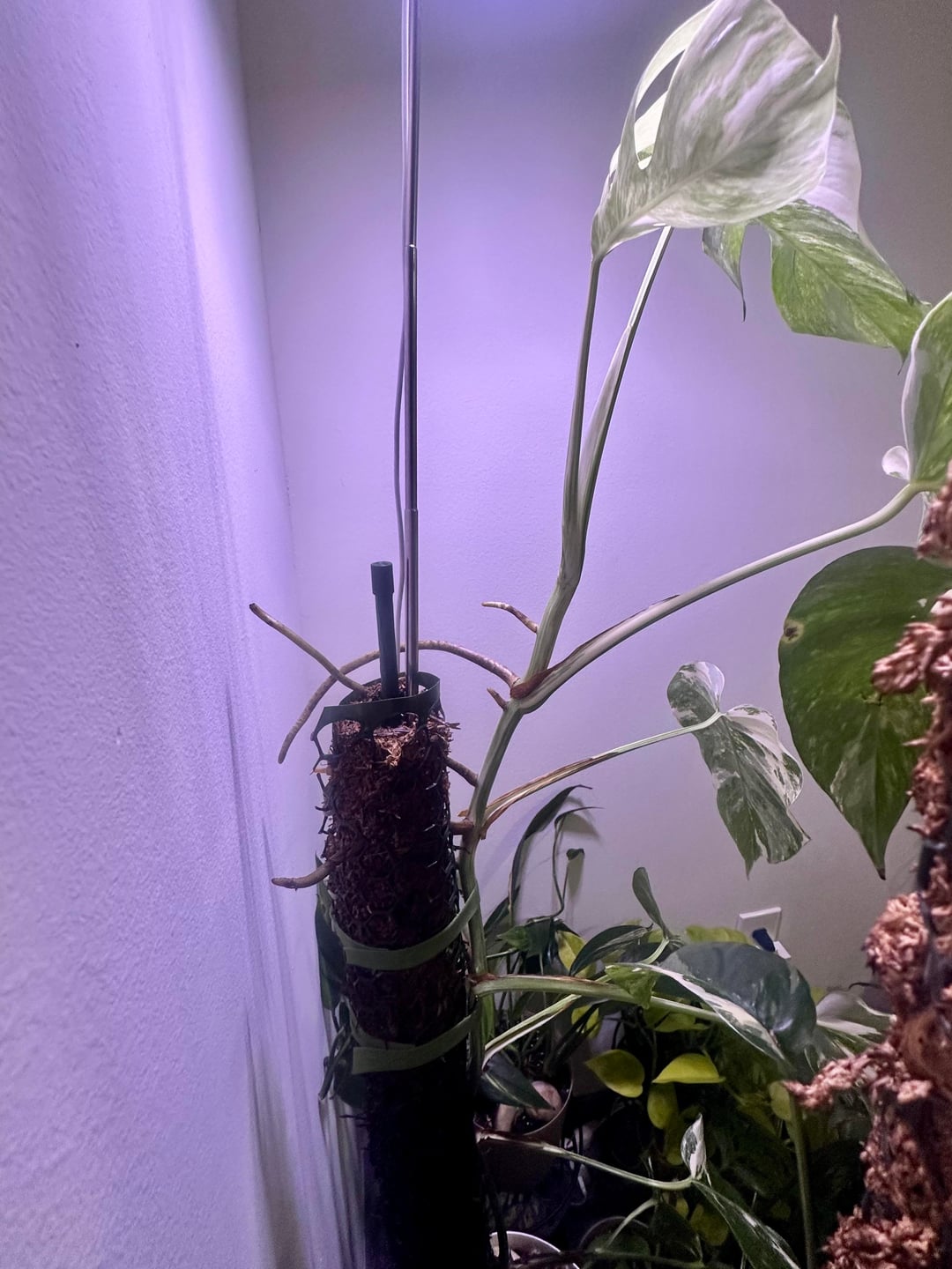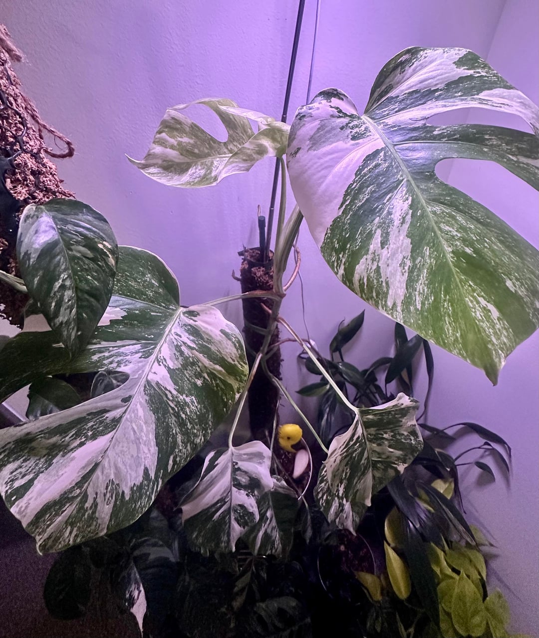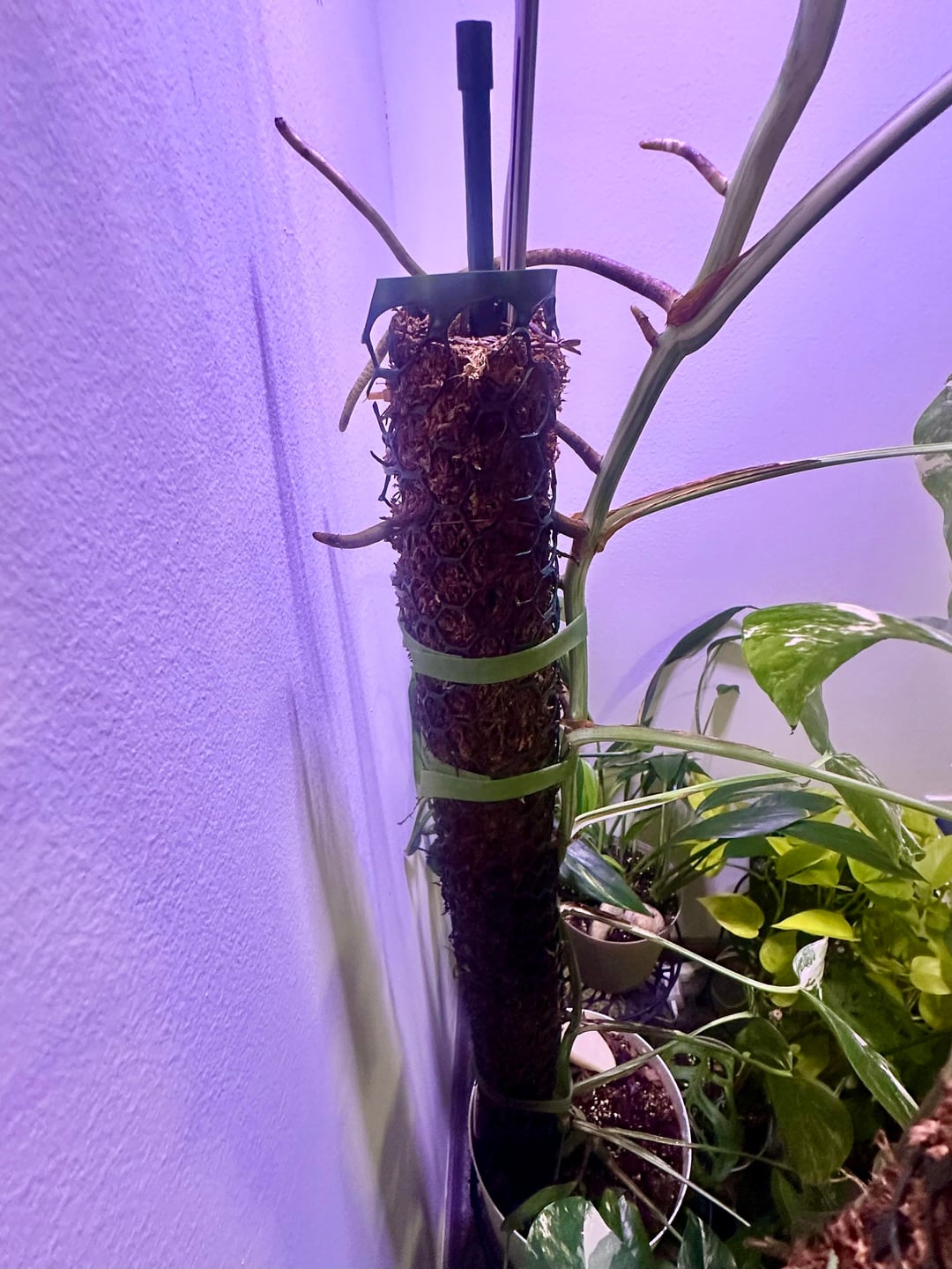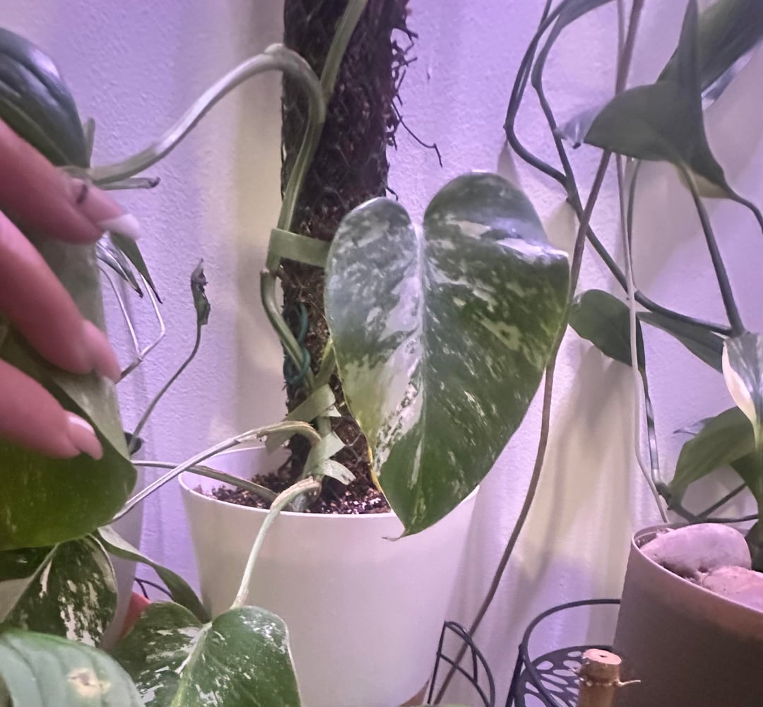 新しい葉と過去の 2 つの葉の写真 + 苔のポール/気根の写真、サイズ比較のためのポット (米ドル) が含まれています。ポールの長さは約27インチです – 土の上部から測定しましたが、鉢の底まで伸びています。いくつかの写真のために育成ライトをオフにしました(それが重要であれば笑 🙃)