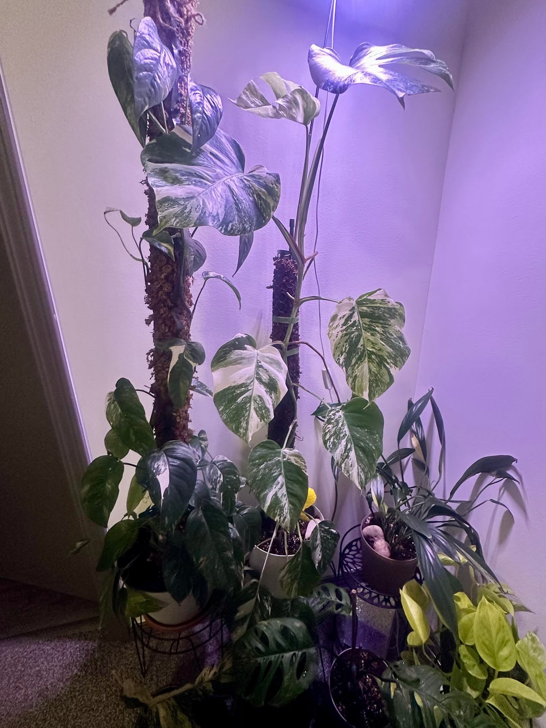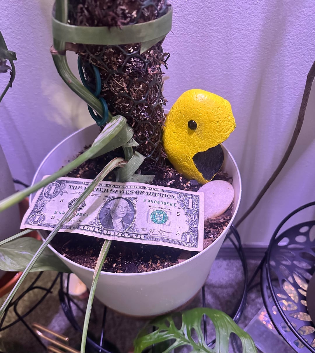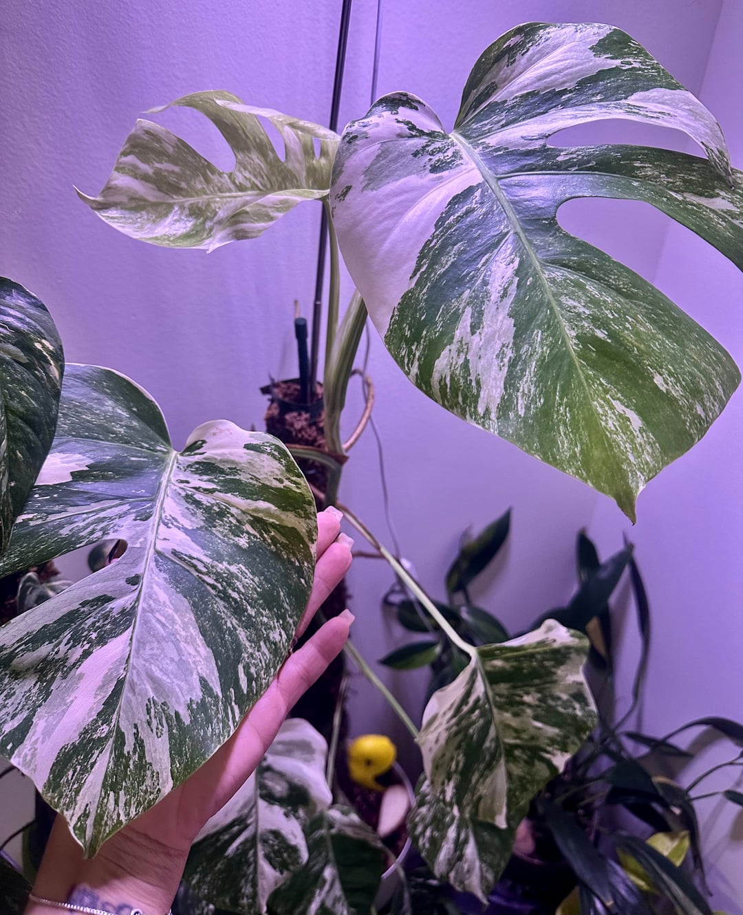 新しい葉と過去の 2 つの葉の写真 + 苔のポール/気根の写真、サイズ比較のためのポット (米ドル) が含まれています。ポールの長さは約27インチです – 土の上部から測定しましたが、鉢の底まで伸びています。いくつかの写真のために育成ライトをオフにしました(それが重要であれば笑 🙃)