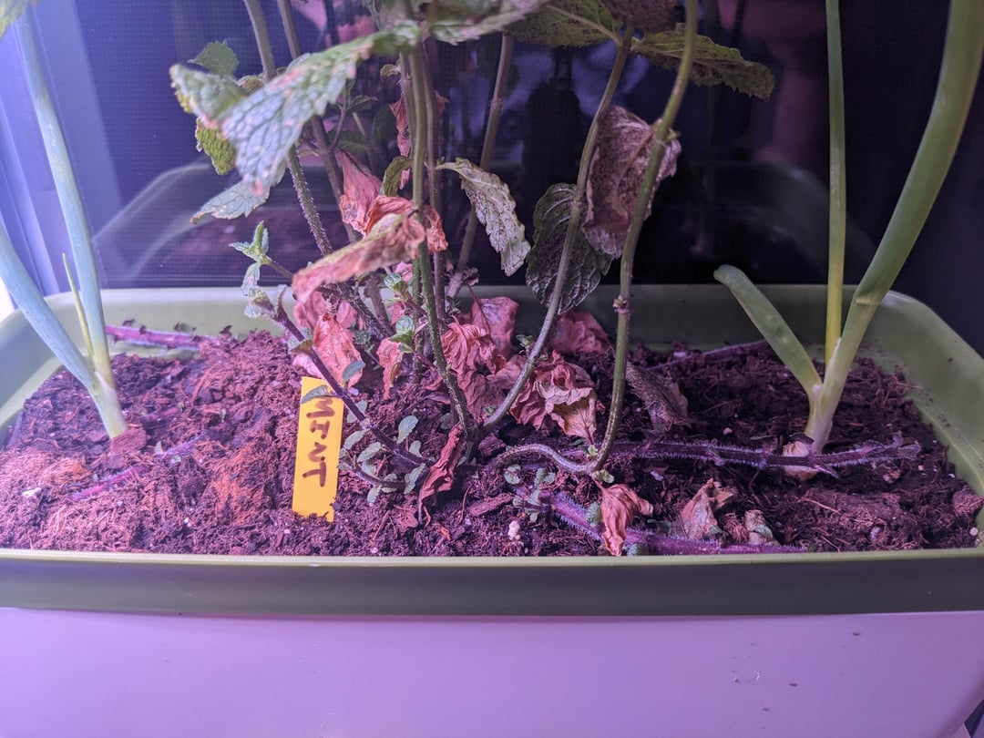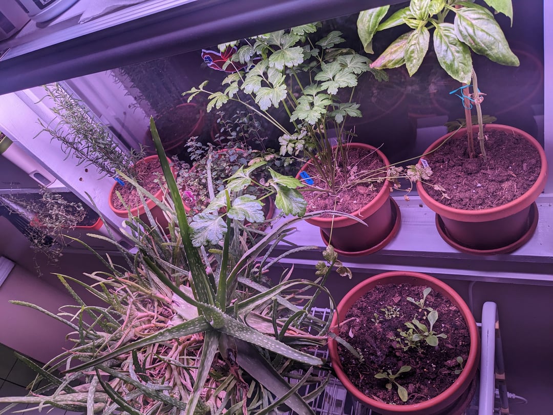 タイムの調子があまり良くありません。おそらく光が少なすぎるのと、自動水やりプランターが新しいので、土が少し湿りすぎていると思います。