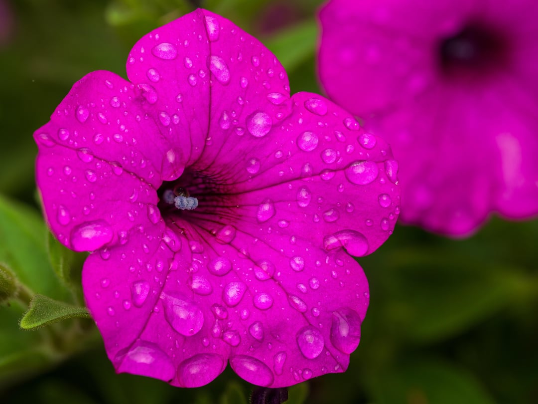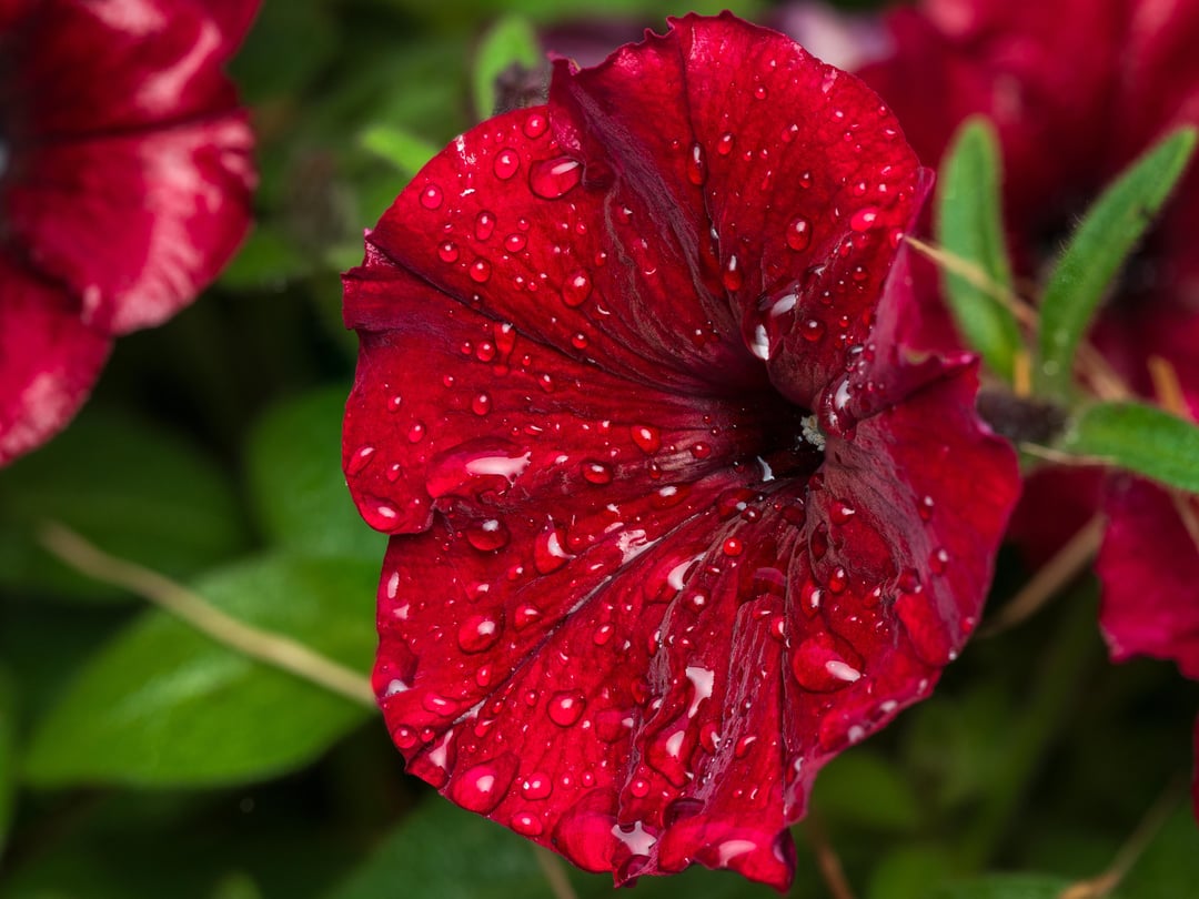 雨が降った後のスーパーチュニア ジャズベリーとブラックチェリー。