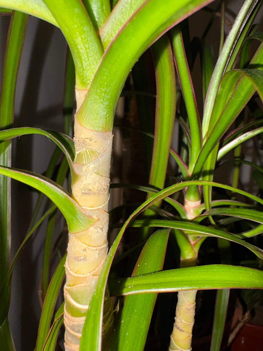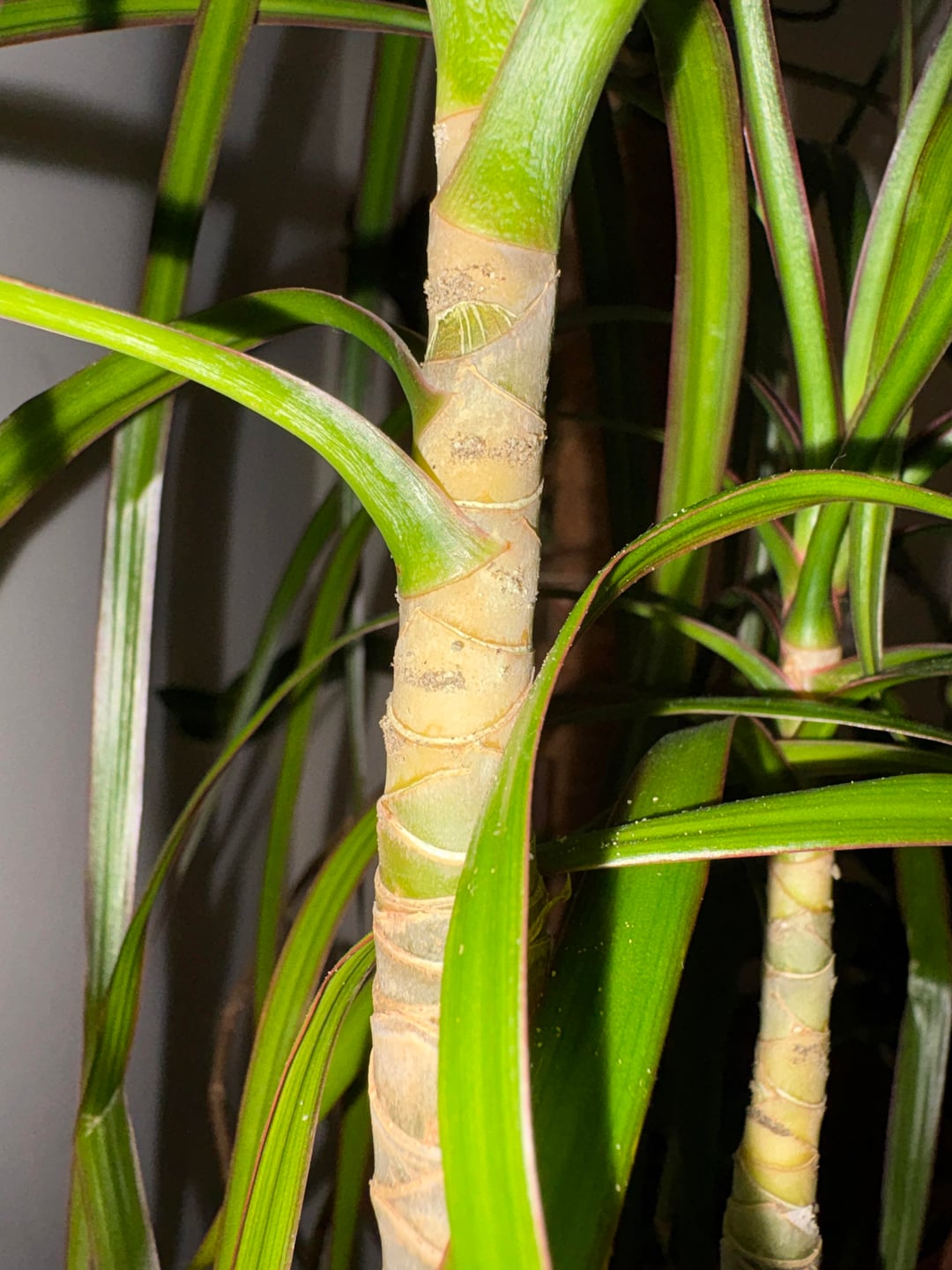 私のドラセナについているこれは何ですか?それはただの塵ですか、それとも寄生虫ですか?何も動いているのがまったく見えず、ただこれらの茎の上にあるだけです