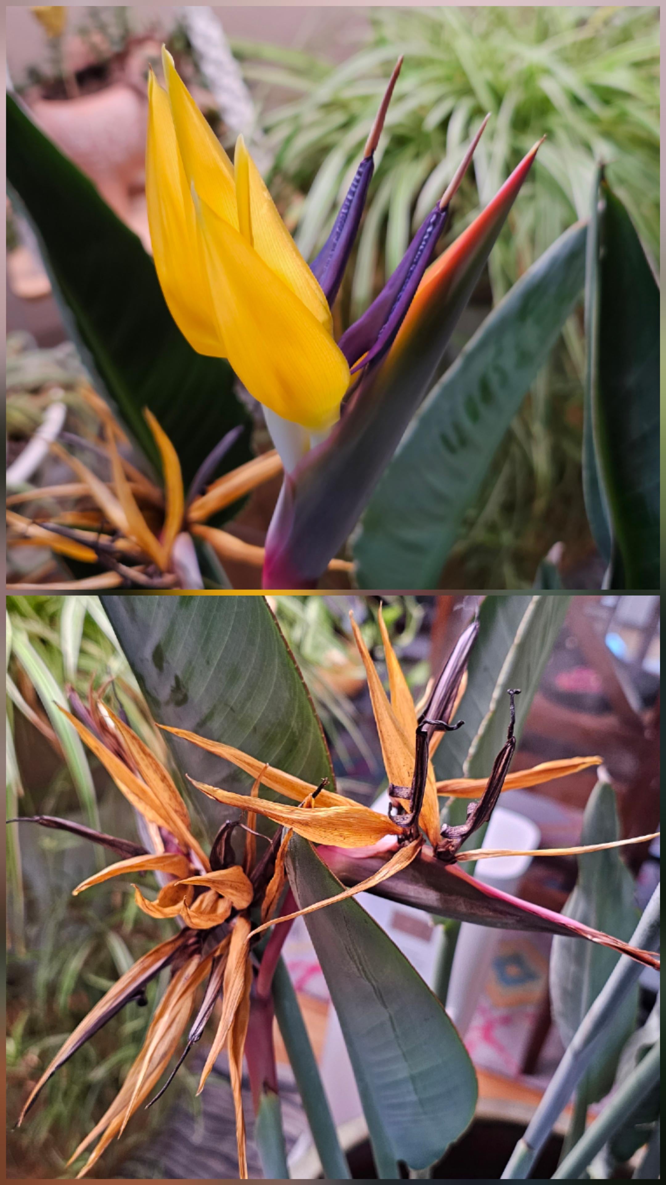 Bird of Paradise にある古い花はどうすればよいですか? (下の写真) トリミングするか、放っておくか?