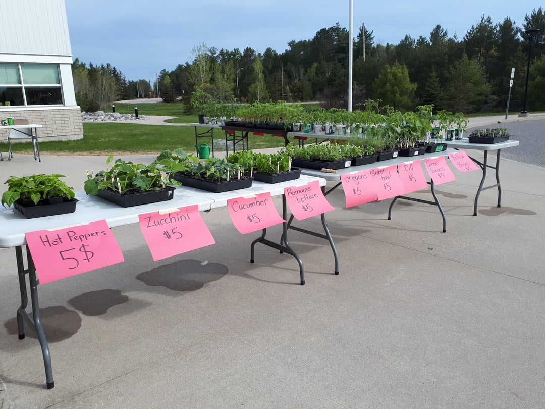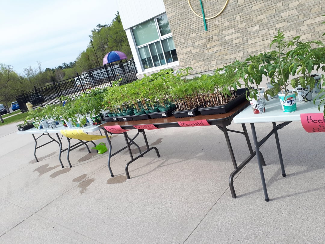 やがて、ピーマン、ズッキーニ、キュウリ、ロメイン、バジル、ディル、オレガノ、インゲン、黄色インゲン豆など、苗の列がスペースを埋め尽くしました。基本的に、照明の下に収まるものはすべてありました。準備ができたら、私たちは彼女の学校に運び、外にテーブルを設置しました。