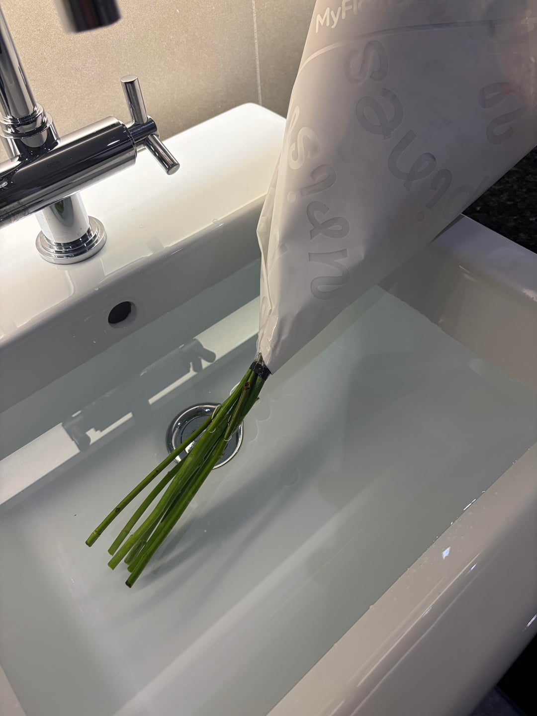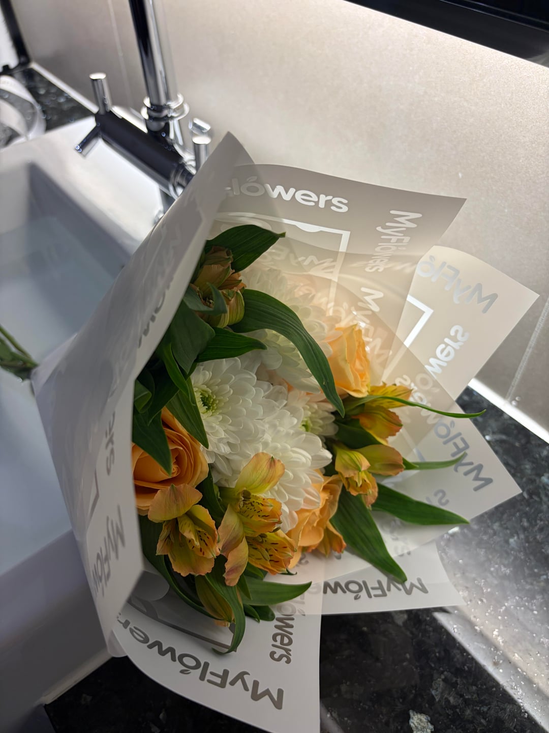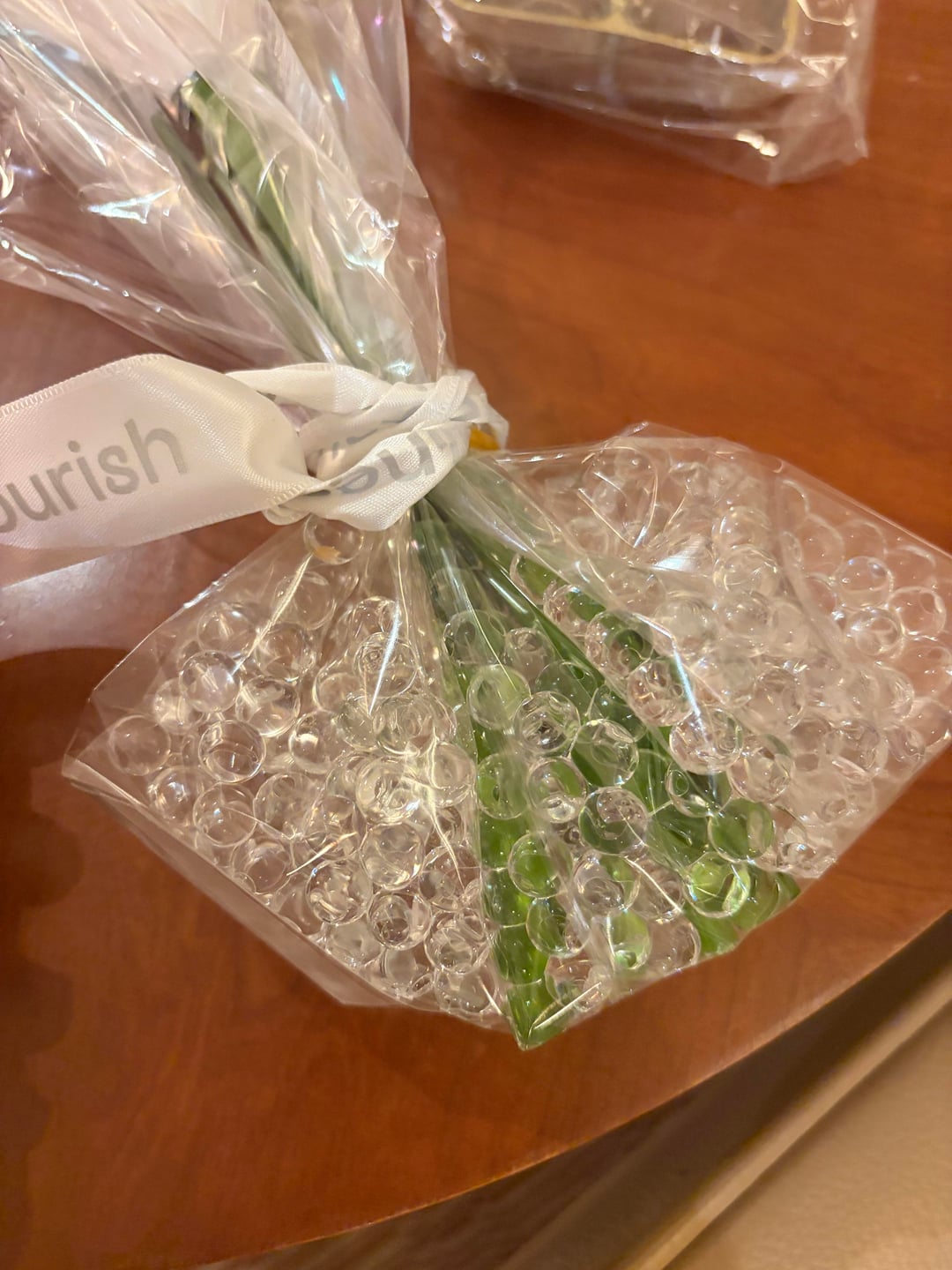 今、花束はほとんど包まれたまま、冷たい水の入ったホテルのシンクの中にあり、茎は水に浸かっています。