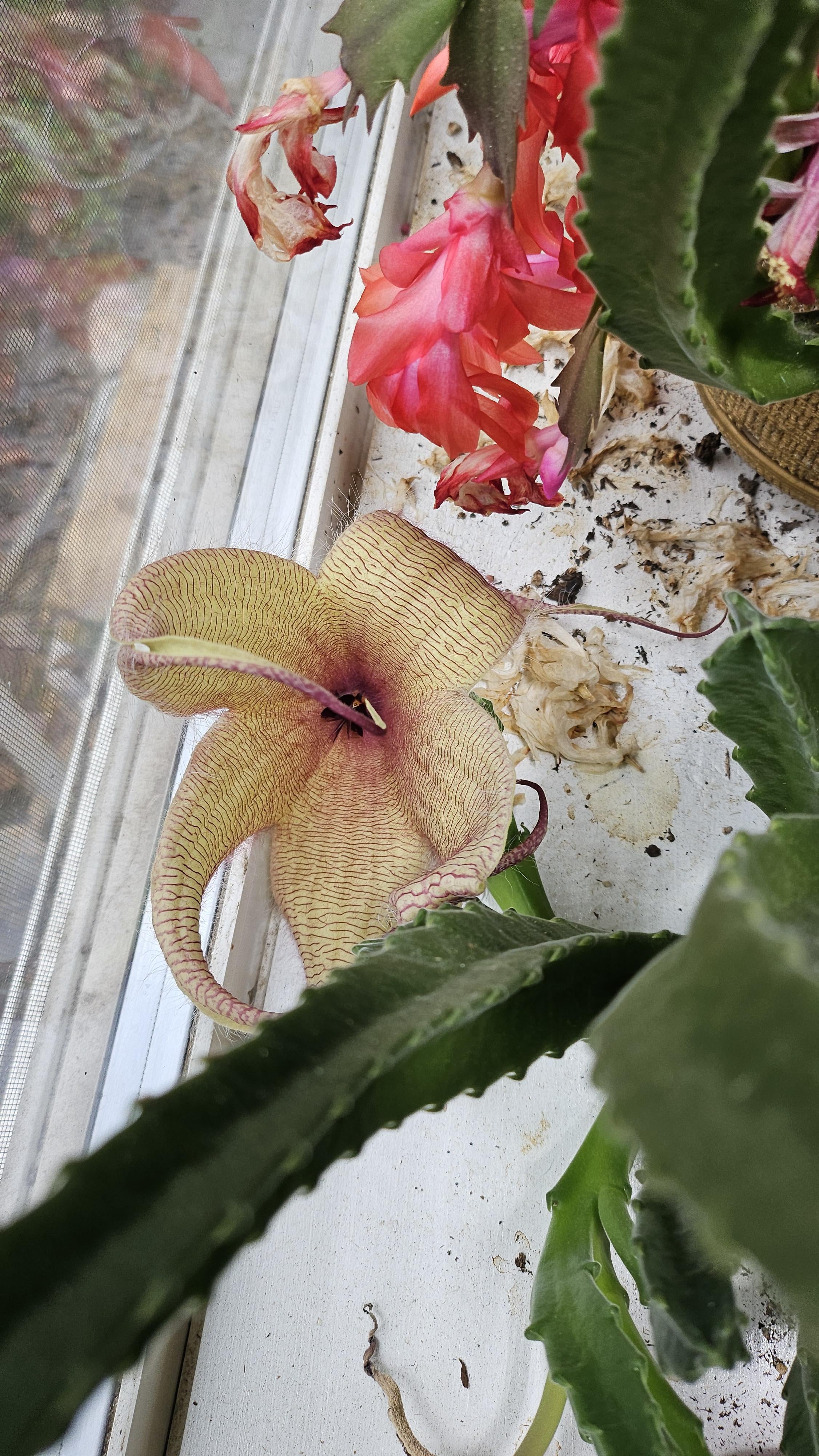 これはとてもクールだと思いました。父のサボテンに2年連続で大きなヒトデの花が咲きました!写真では分かりにくいですが、かなりぼやけています。花の長さはおそらく8インチです。