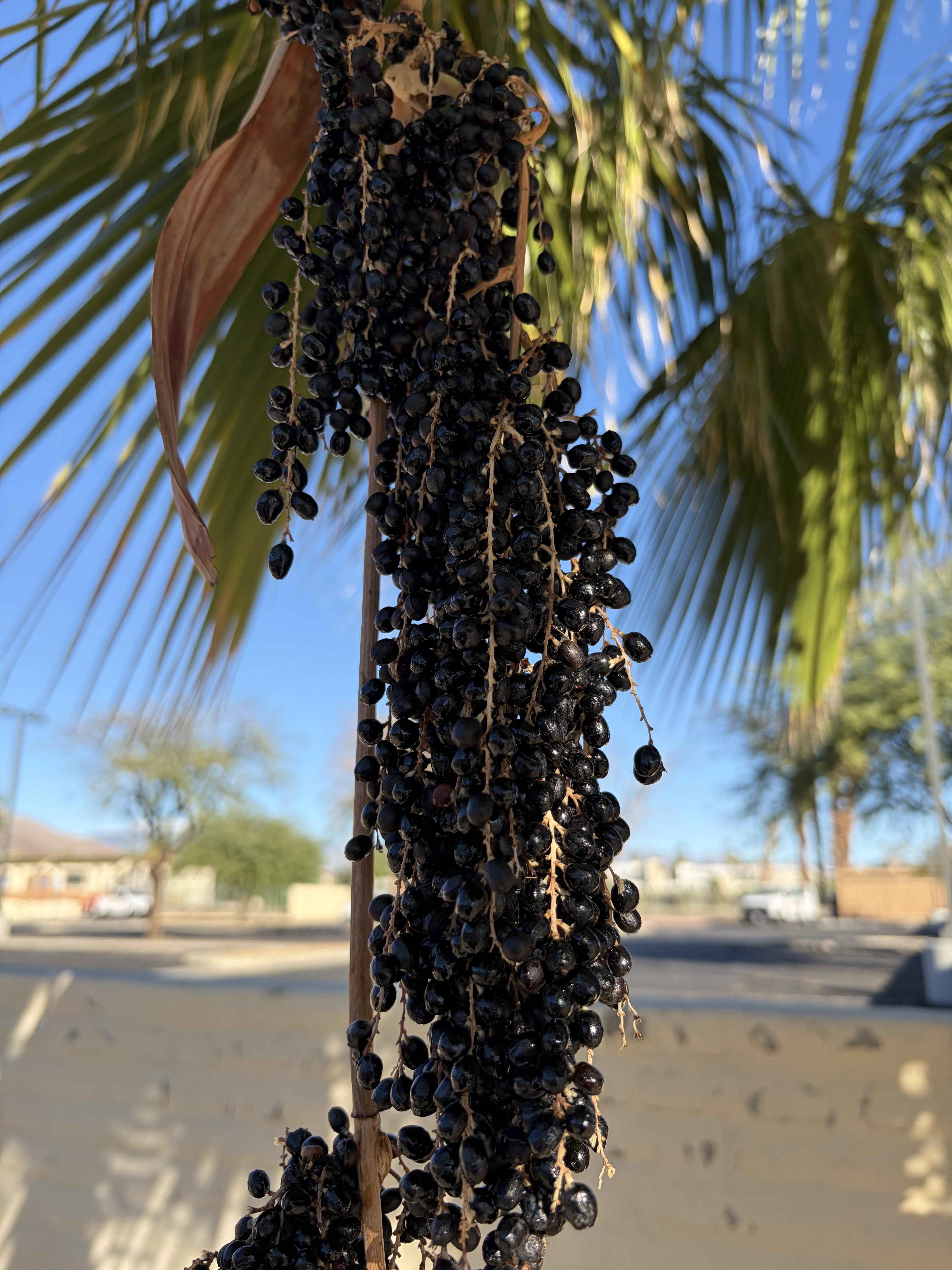 私はパームスプリングスにいて、これらのベリーに出会いました。写真を撮ったところ、アサイーヤシの果実であることがわかりました。知っている人はいますか?食用?初めてなので優しくしてください(笑)!