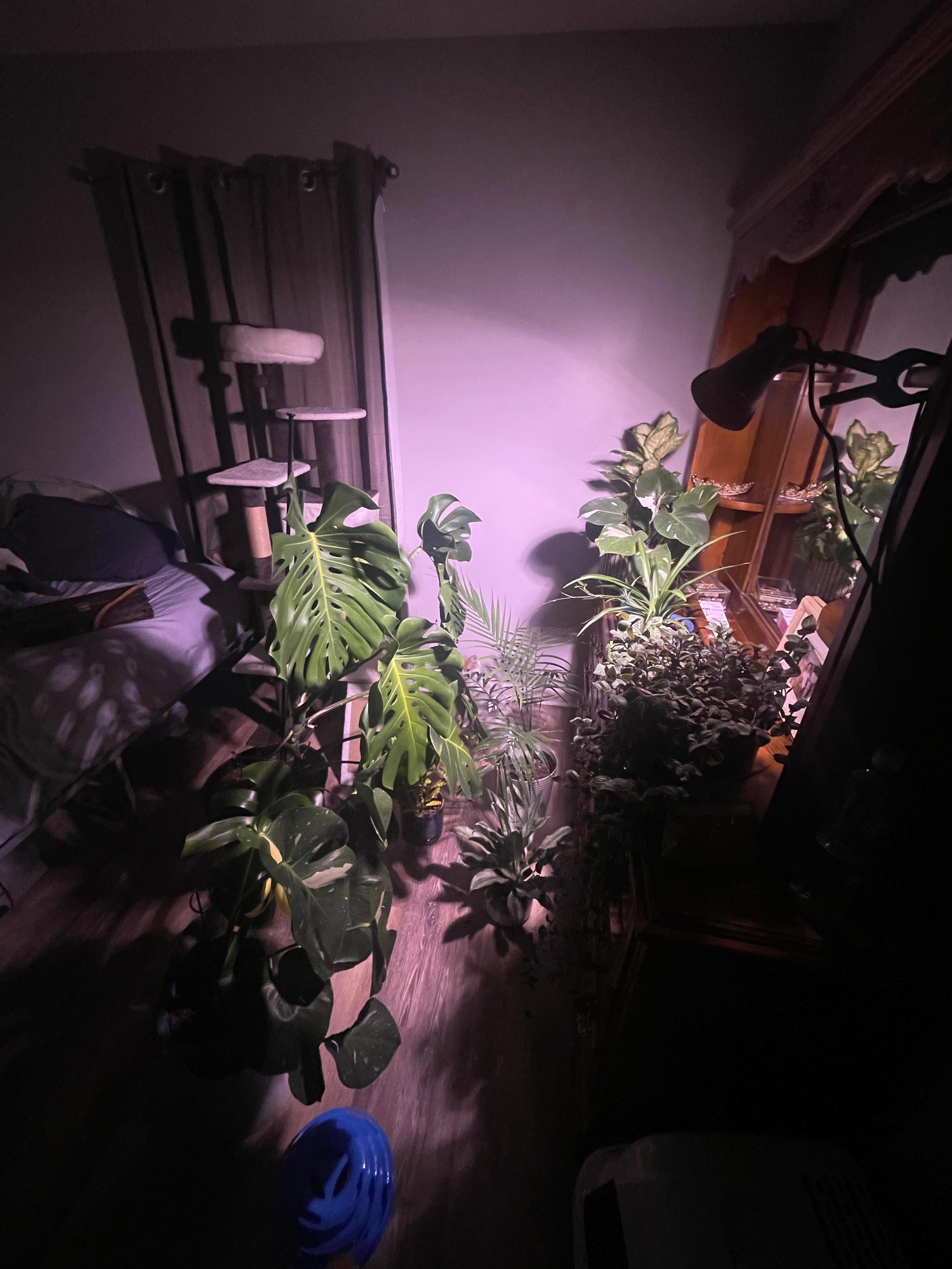 私の主な質問: グロー ライトが主な照明源になることはわかっていますが、すべての植物にその明るい間接光や朝の直射日光を模倣するには、何個のグロー ライトを用意する必要がありますか?一部の植物が少ない光でもうまく育つ場合、1 日数時間育成用ライトに直接さらされると、間接的な日光に比べて有害になりますか?フロリダの冬はすでにかなり乾燥していて、植物の成長が収まるサイクルが始まっています(これも、私が出発する前に新しい葉を出し始めた大きなモンステラを除いて)植物が一緒にいることで十分な湿度になるでしょうか、それとも加湿器を買ったほうがいいでしょうか?