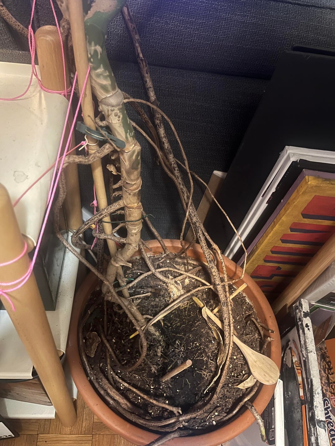 この事態は制御不能になりつつあります。あまりにも多くのスペースを占有しています。伐採して植え直すことも考えていますが、結局ここに戻ってしまいます。できれば売りたいのですが、紐が解けるとすぐに倒れてしまいます。ルームメイトはゴミ捨てろと言っています。