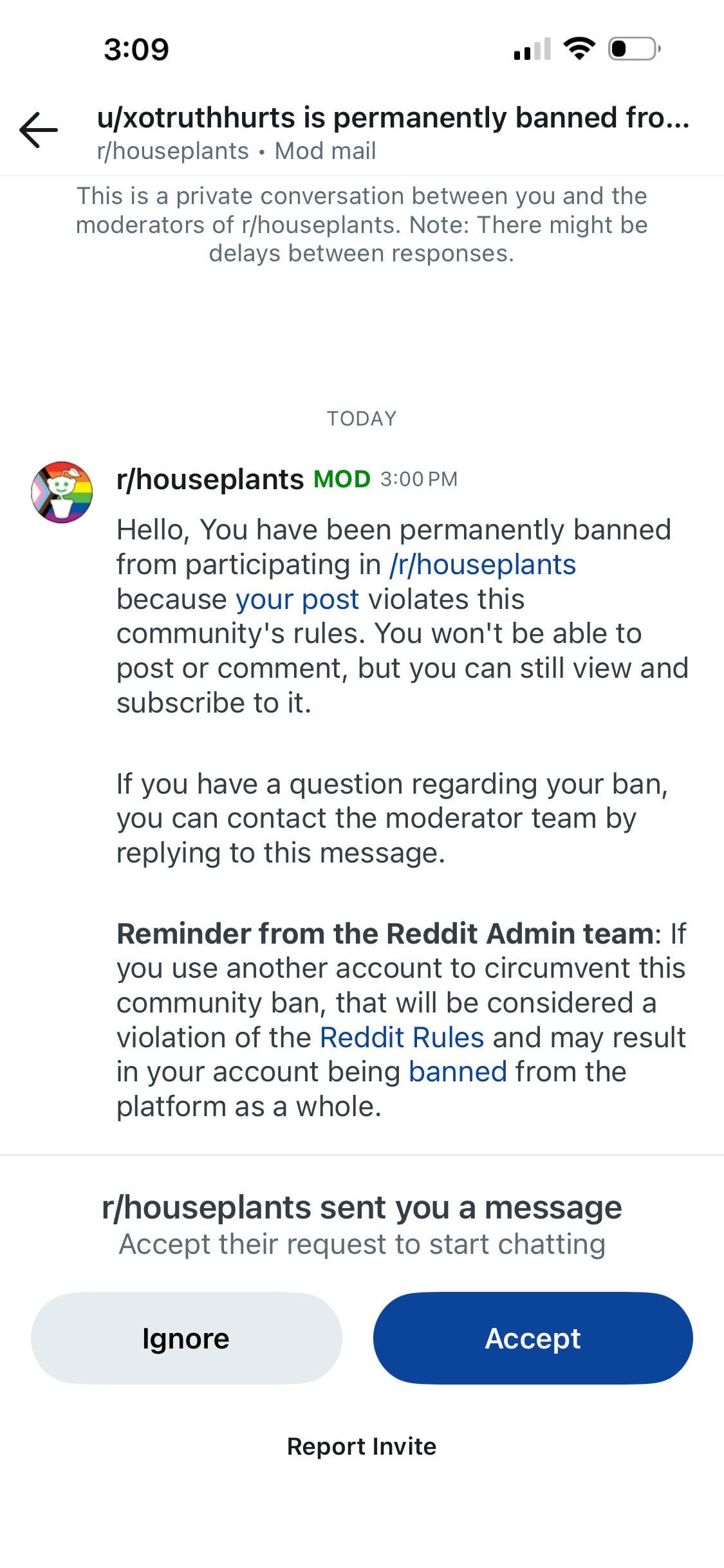 についての投稿に追加 r/観葉植物 説明なしに禁止する。そこでスクリーンショットを撮り、MODに何が起こっているのか尋ねました。予想通り、私も禁止されました 😂 でも、それだけの価値はあります。それが公式です r/観葉植物 MODはロッカーを外しています。