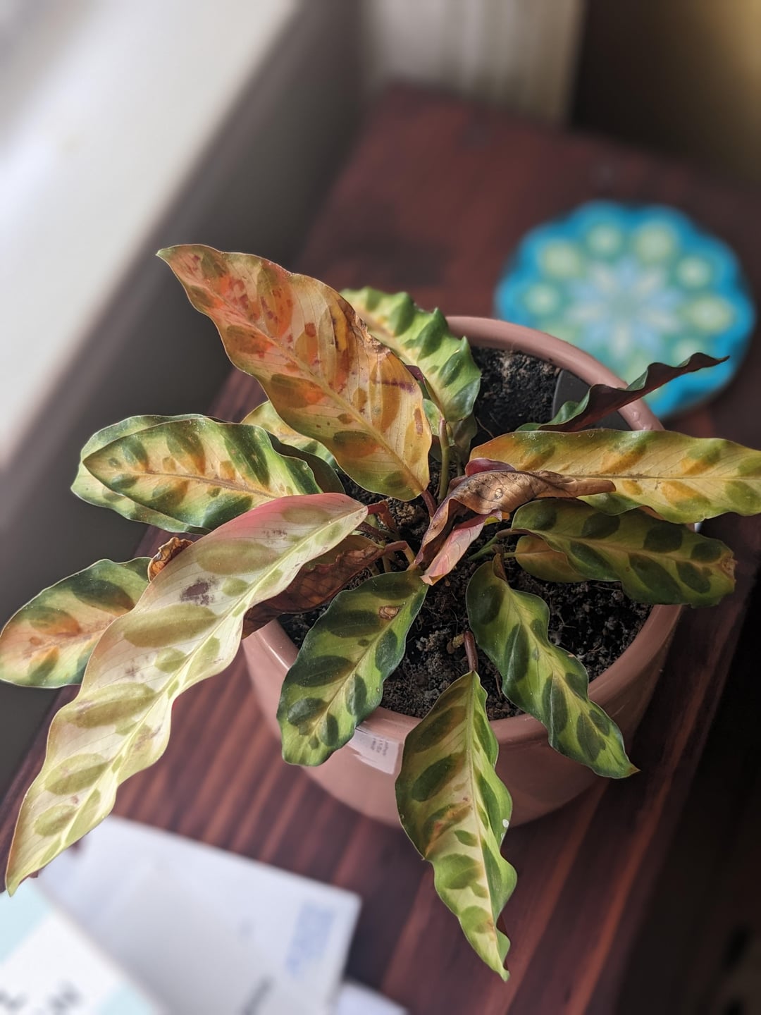 うちのガラガラヘビ・カラテアの調子が良くありません。それは私にプレゼントされたもので、月に一度水やりをする EasyPlant の 1 つです (友達は私がそれを殺してしまうのを知っているので、とにかくそうなっているようです 😭)。これらの観葉植物が気まぐれであることはわかっていますが、この状況を変えるにはどうすればよいでしょうか?日差しが強すぎるのか、それとも寒すぎるのか(参考までに、私はメリーランド州在住です)。