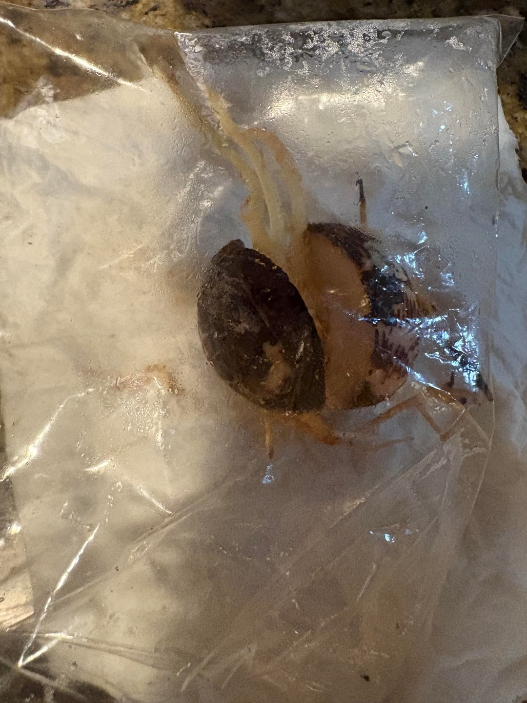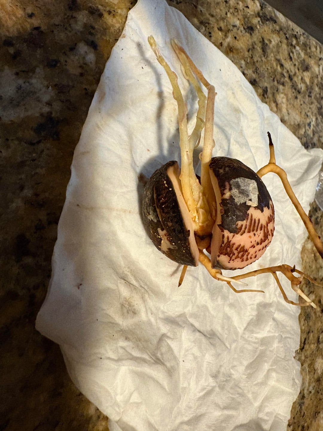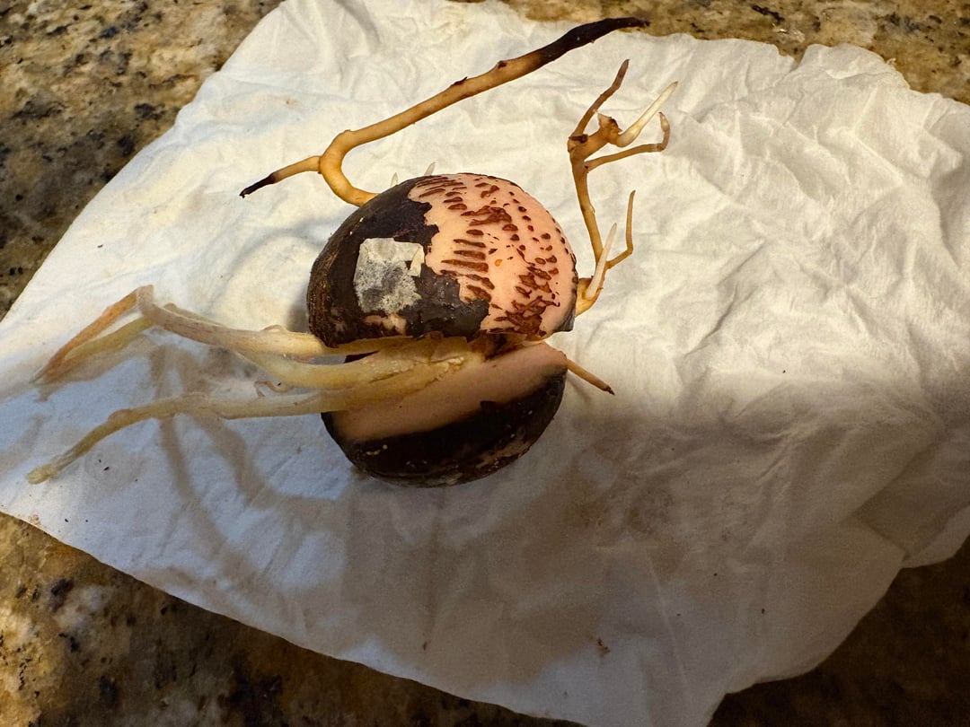 アボカドの種を発芽させることに何度か挑戦しました。これは今のところ最高ですが、根は 2 つの異なる方向に向かっているようです。これらのうちの 1 つは単なる茎ですか?今何をすべきでしょうか? 暗いキャビネットの中で、湿ったナプキンを絞ったビニール袋に入れて発芽させました。