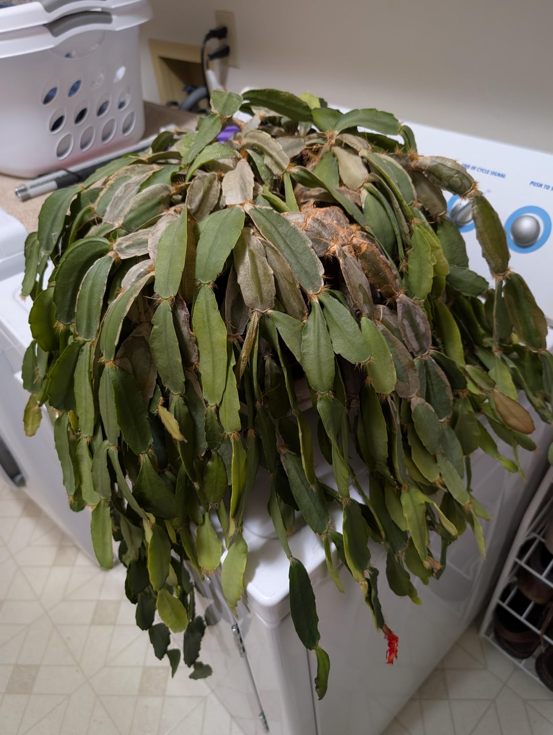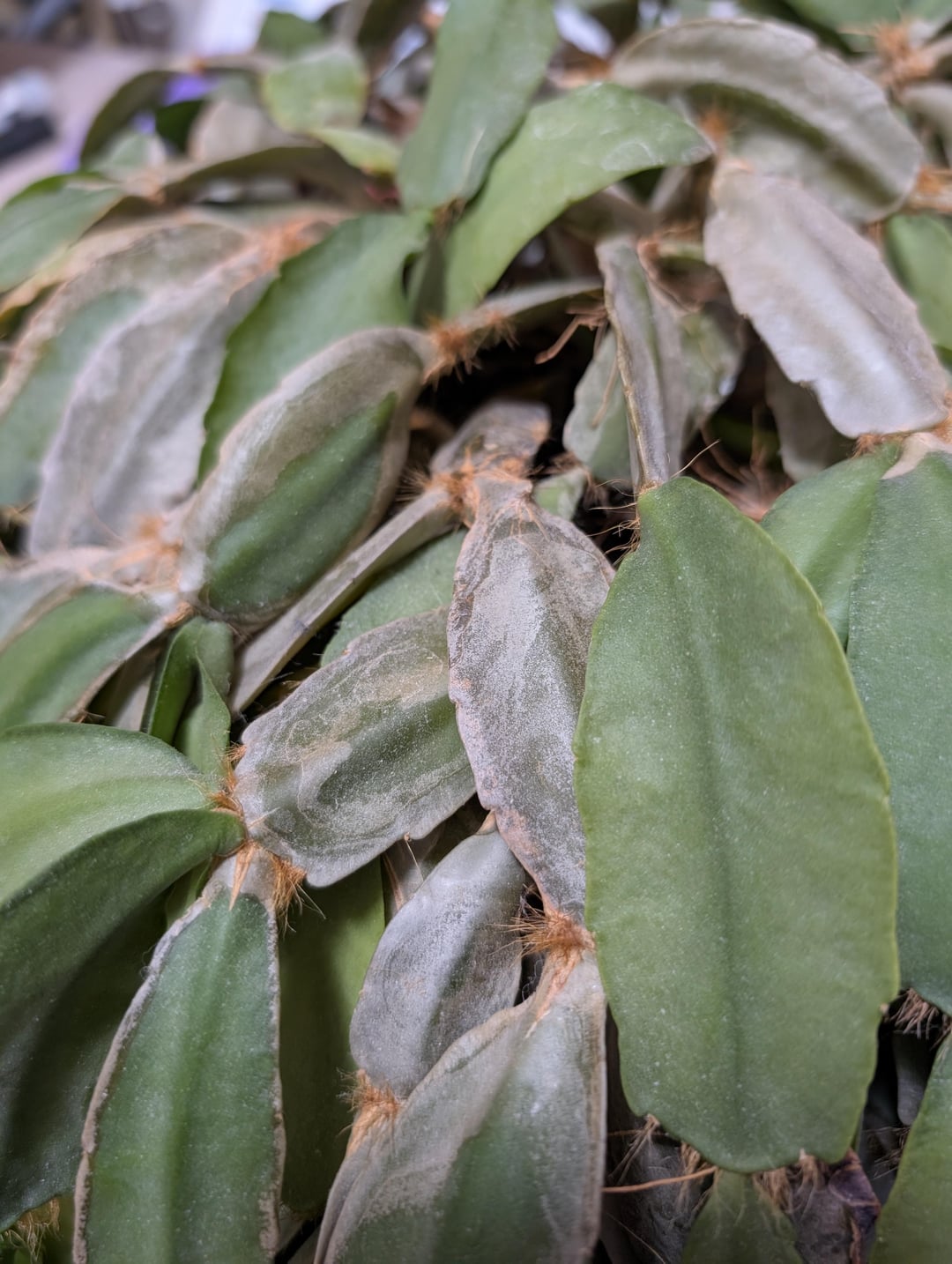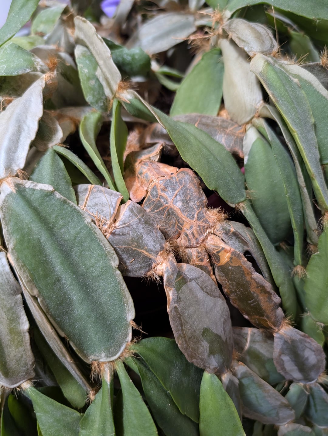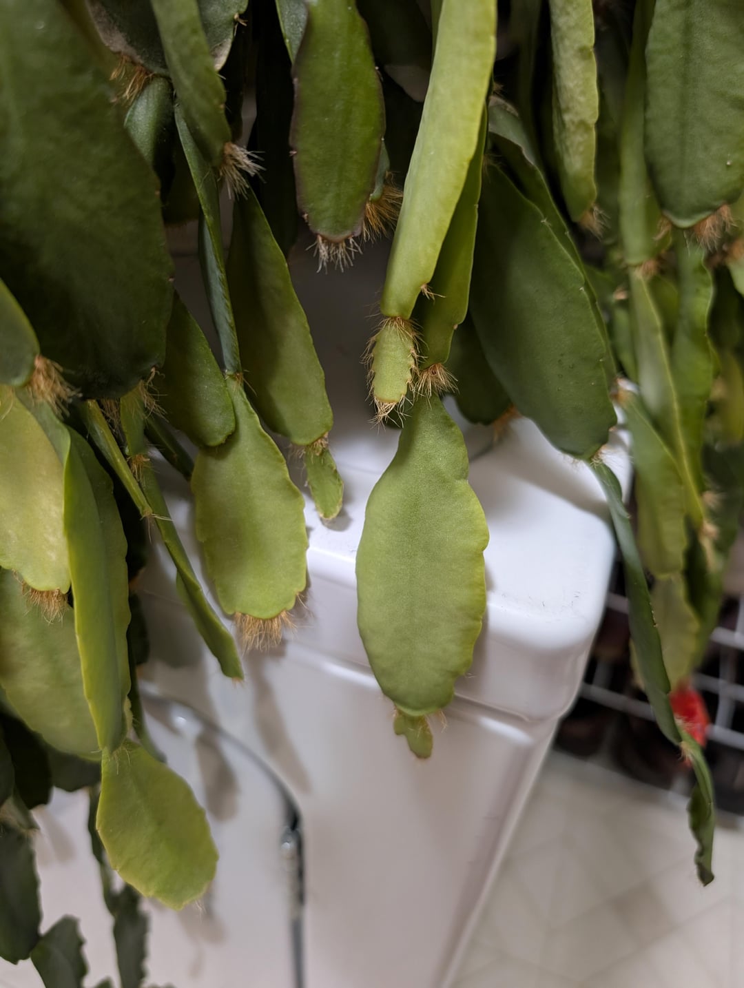 この大きなホリデーサボテンは家族から譲り受けたばかりですが、見た目は少し荒れています。私はサボテンの扱いにあまり慣れていないので、この獣の世話の方法と、粉のように白い葉やひび割れた葉に何か対処する必要があるかどうかについてアドバイスを探しています。先端がかなりぐにゃぐにゃになっているような気もしますが… 水切りトレイ内蔵のプラ鉢に植えてから陶器の鉢にセットしたので、明らかに水のやりすぎでした。ティア!