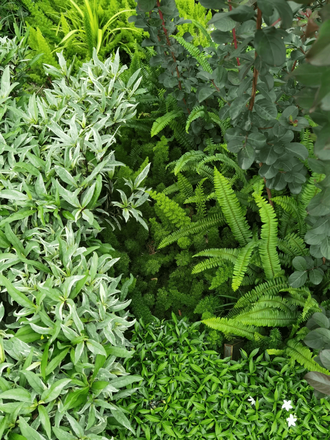 それぞれが異なる種、層、形状を持つ緑色の植物のいくつかのクラスターがペアになっています。近づくと、どういうわけか微妙な空間と秩序の感覚を与えます。