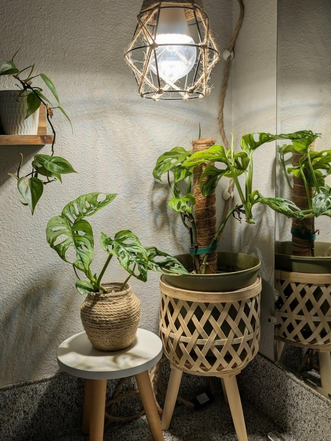 本当はトイレに植物を置きたかったのですが、窓がありませんでした。フックを取り付け、照明器具と栽培用電球を購入しました。モンスターのアダンソニとハートリーフ・フィロデンドロンのためにこの小さなコーナーを設置しました。鉢はそのプラントスタンドには大きすぎるので、いくつかの調整が必要です。窓のないバスルームをどのように改善しましたか?写真を下にドロップしてください👇 インスピレーションをありがとう☺️