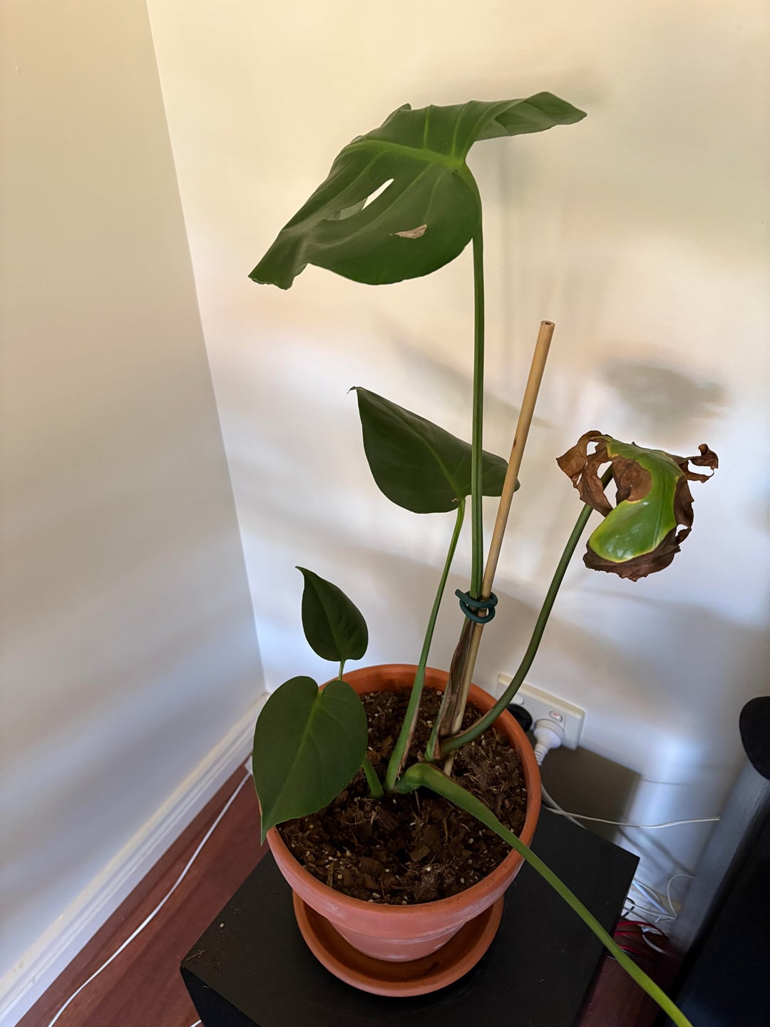 私が知っていることは次のとおりです。 1. かなり乾燥しています。 2. 以前にこれらのうちの 1 つが死亡したことがある。 3. 葉はたくさん落ちましたが、枯れてはいないようです??? 4. これがモンステラであることはわかっていますが、大丈夫そうですが、実際には成長していません。 5. かなり垂れ下がっており、垂れ下がっています。 6. 葉の裏に茶色の斑点、真菌?