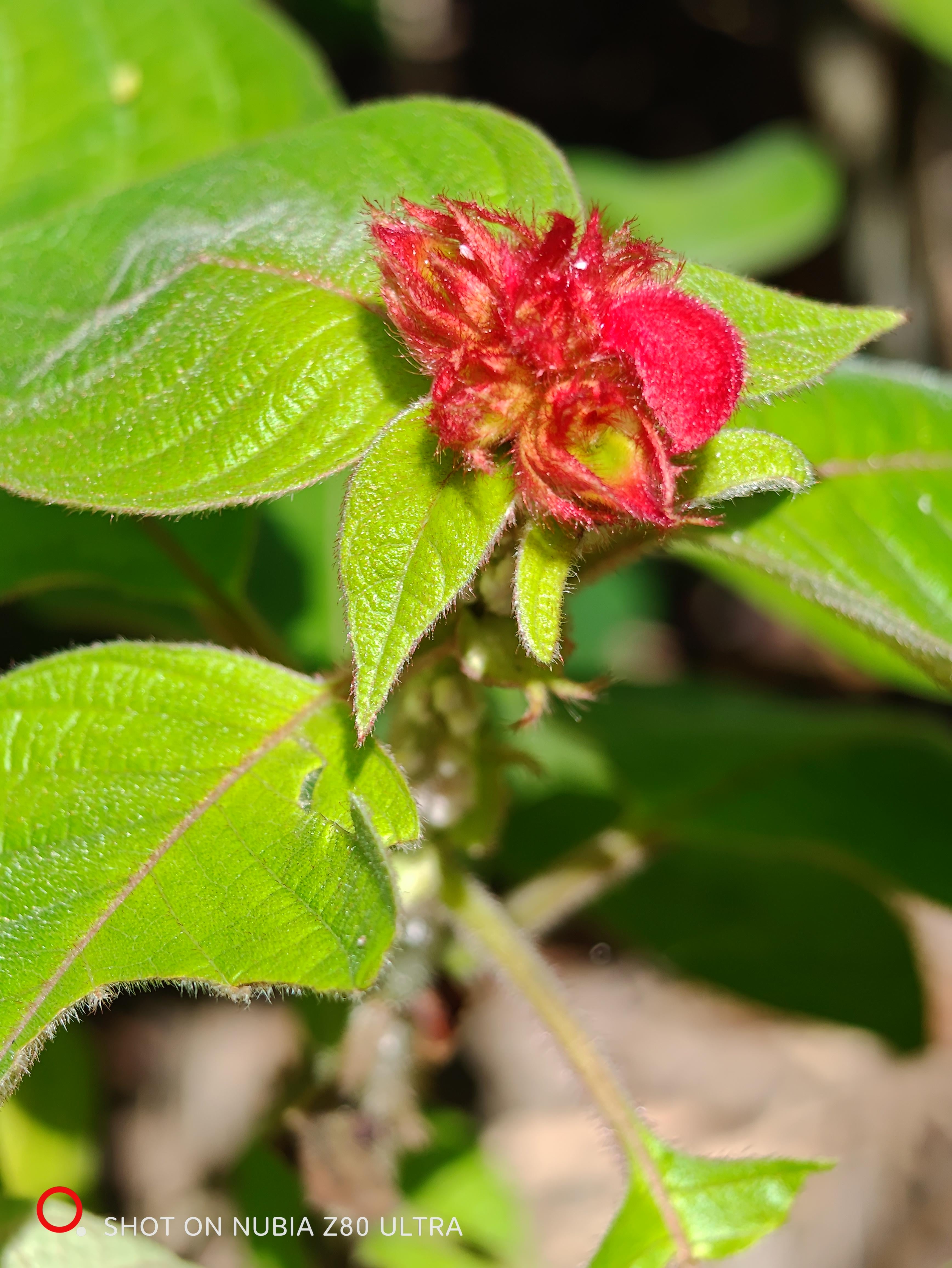 独特の毛むくじゃらの質感とそれを囲む葉から、その赤い物体はシンガポール シャクナゲ (Melastoma malabathricum) の若い果実 (または成長中の果実) であることがわかります。あなたが見ているものは次のとおりです: * "毛深い" 見てください: マクロ撮影ではっきりと写った赤い鱗状のテクスチャは、がく (花を保持する保護カップ) です。紫の花びらが落ちると、このカップは赤くなり、中で発育する種子を保護するために膨らみます。 *A "ブラックマウス" スナック: この赤い果実は完全に熟すと、不規則に裂けて、中に濃い青/黒色の柔らかい果肉が現れます。 * 豆知識: 学名 Melastoma は、実際にはギリシャ語の「Melastoma」に由来しています。 "ブラックマウス" (メラス + ストーマ) 果肉を食べると舌が黒く染まるためです。鳥(そして時には子供たち)にとっても大好きなおやつです。他の写真で撮影した紫色の花と同じ植物の一部なので、とてもよく合います。