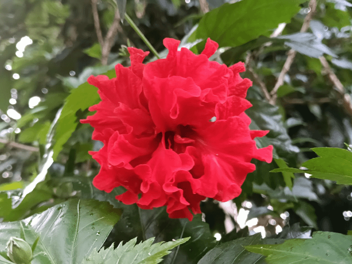 この波立った赤いハイビスカスが今日スポットライトを盗むことにしました