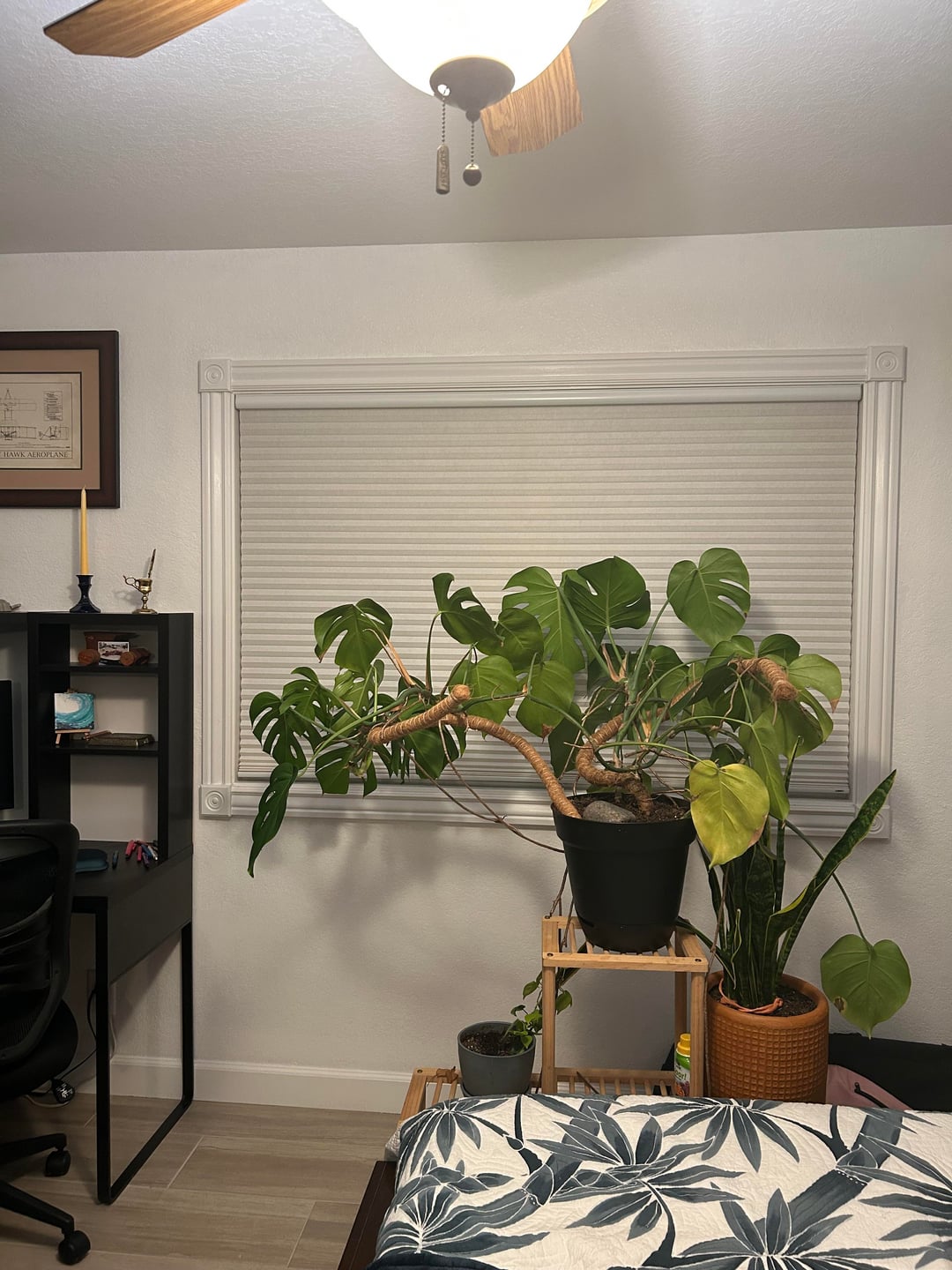 この西向きの窓の前の空き部屋にシェードを下げて住んでいますが、隅っこか葉が繁るのが見える場所に高くそびえ立っている方が似合うと思います。
