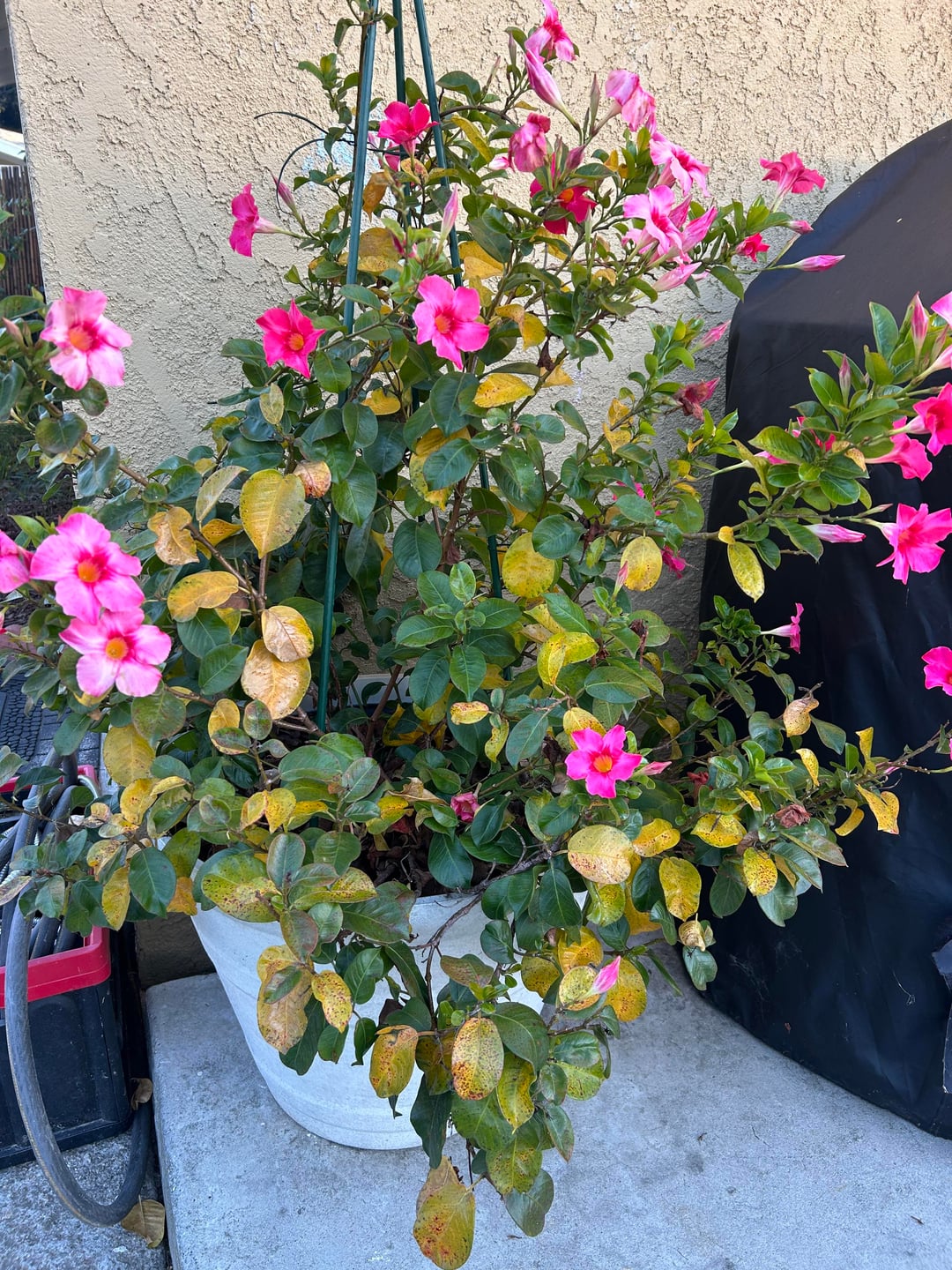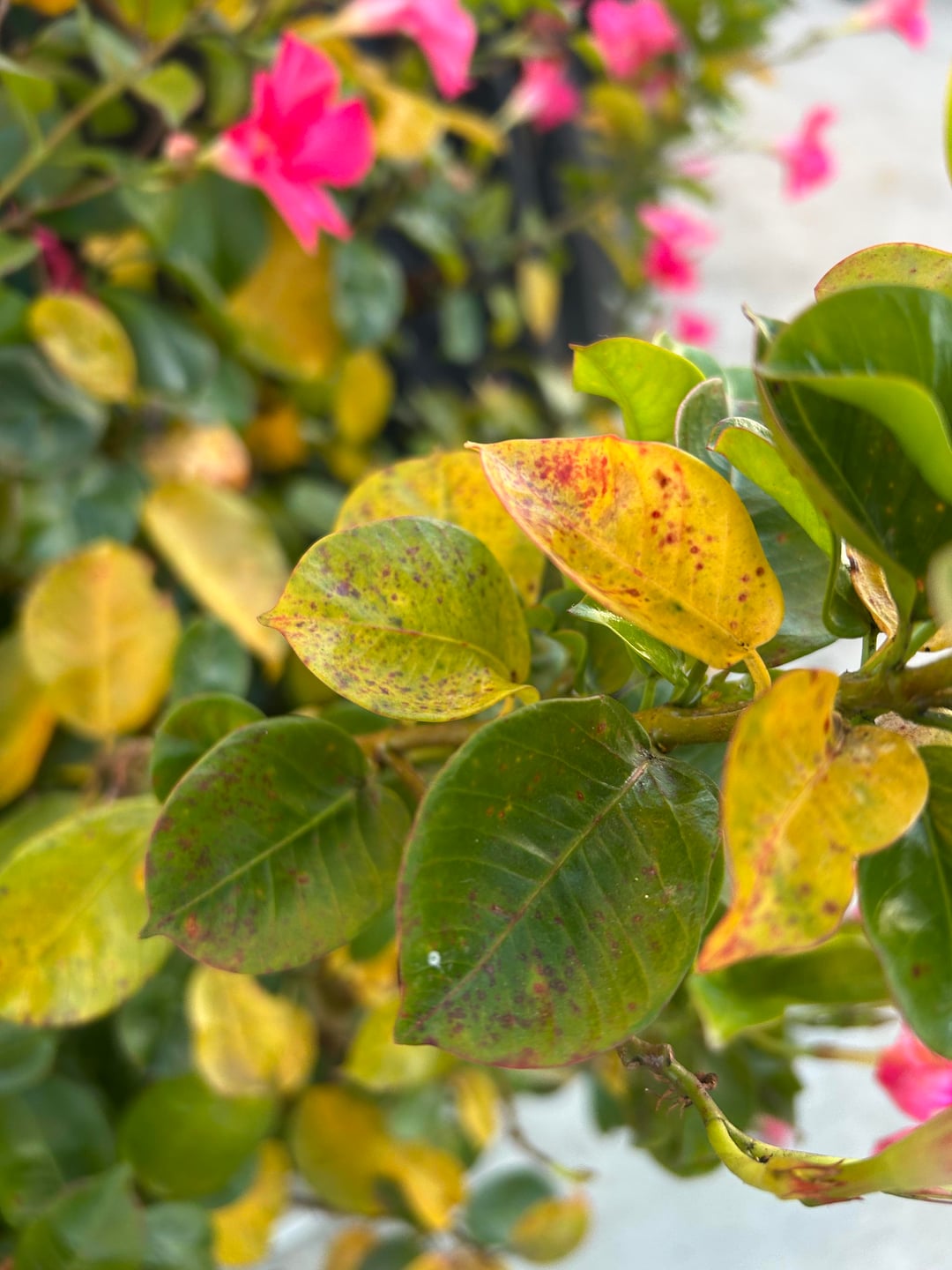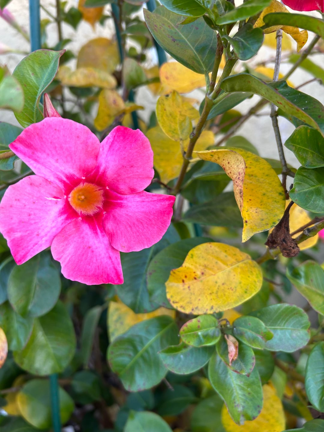 私のマンデビラは春から夏にかけてずっと素敵でした。 1週間ほど雨が続いた後、最近天気が悪くなり始めました。 これが「さび病」の正体なのか、それとも別の病気なのか、あるいは私の植物が単に冬に向けてある種の休眠状態に入っているだけなのか、私にはわかりません。 (去年の彼女はこんな風ではなかったと思いますが。) 私は気候を参照するために南カリフォルニアにいます。 助けてください!ありがとう