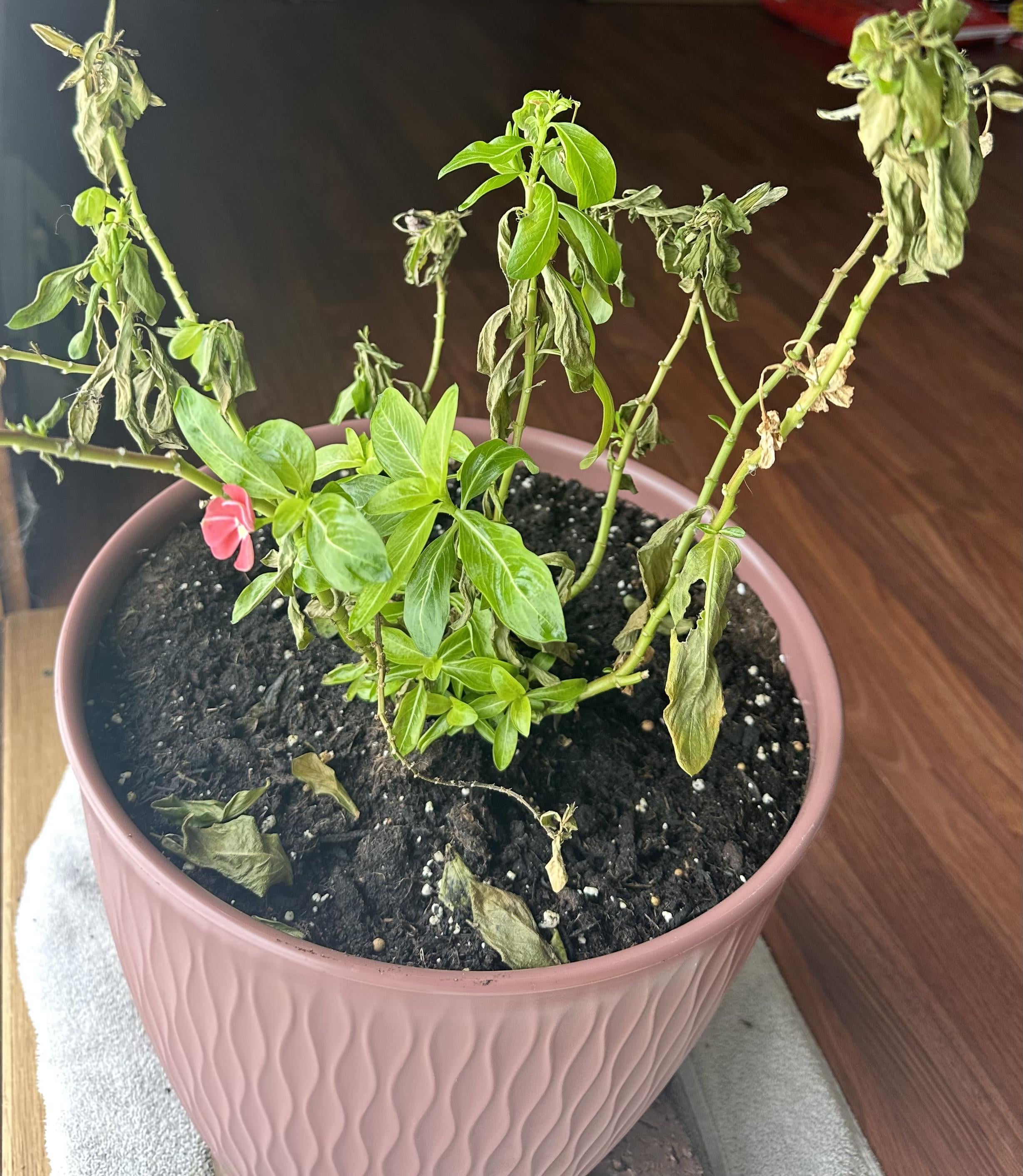 約3週間前、これをより大きな鉢に移しました(2年前から植えてから3回目の移し替え) ご覧のとおり、健全に見える成長はありますが(ピンク色の花さえも)、その多くは枯れているか、しおれているように見えます。全体的な健康状態を改善するために、それらをカットする必要がありますか?ご提案をお待ちしております。冬は寒いし、春から外に出て数か月経ち室内にいます。 インディアナ州