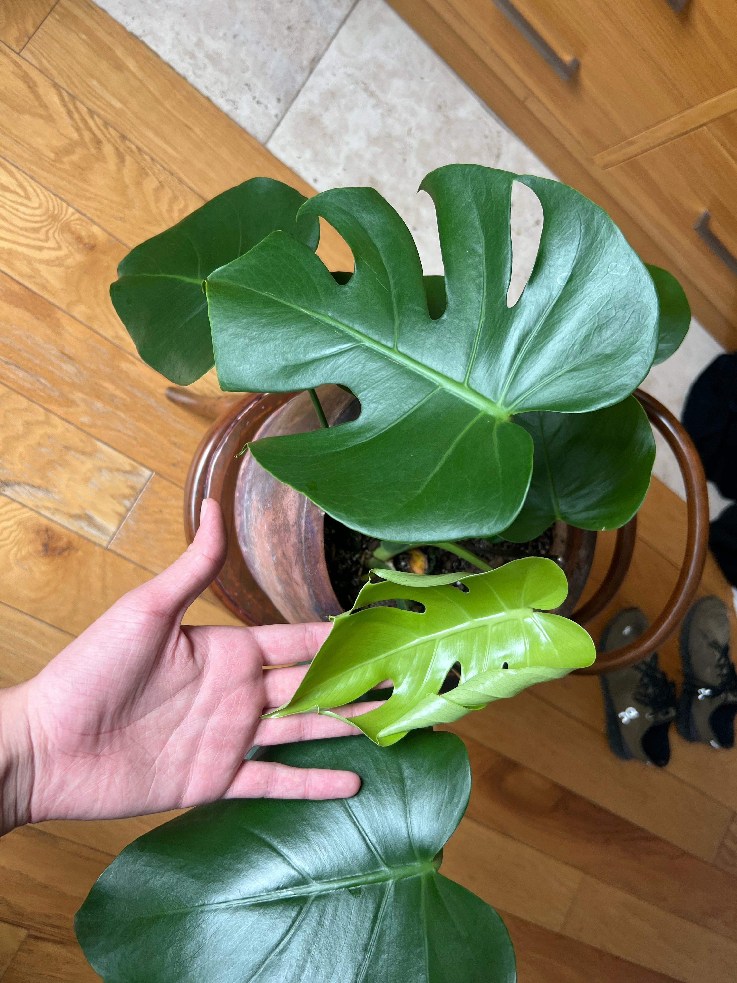 たくさんの穴が開いた新しい葉を出しているモンステラですが、それは小さいです