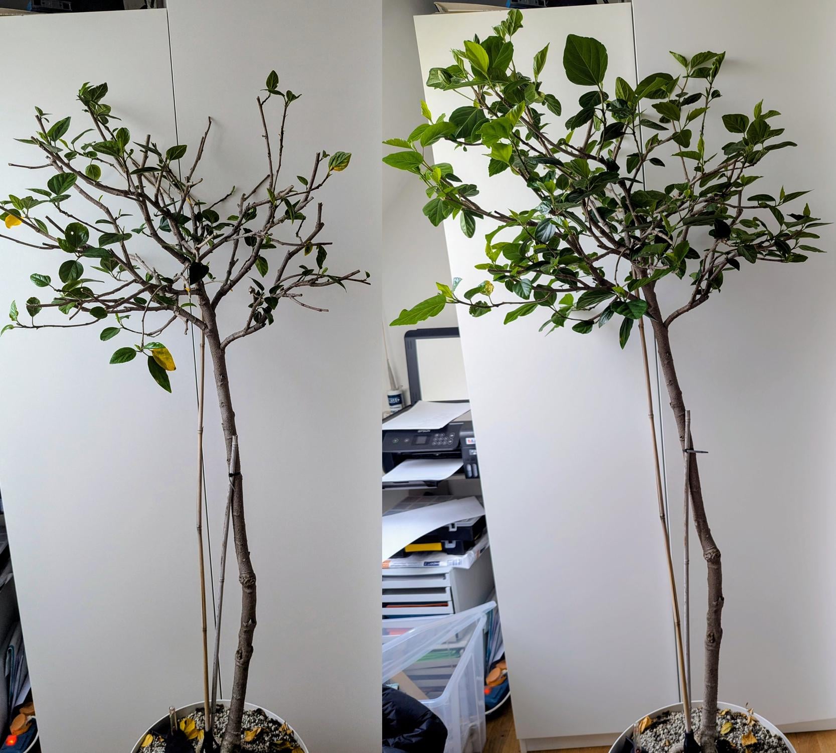 私は持っています ハイビスカス・ローザ・シネンシス 毎年5月から10月まで庭で過ごします。初霜が降りる予報が出たら室内に取り込みます。夜間の気温 41 ~ 50 °F、日中の気温 50 ~ 59 °F から、居心地の良い 72 °F の屋内に突然急上昇すると、私のハイビスカスはいつも動揺し、葉の約 80% が落ちます。最初は黄色に変わり、その後落ちます。毎年その時間を使って、少し剪定して形を整えています。左が11月9日、右が今日の写真です。 1か月以内に再び葉が茂ります。もちろん、この段階では軽く肥料を与えます。もう10年くらいそうし続けているんです。