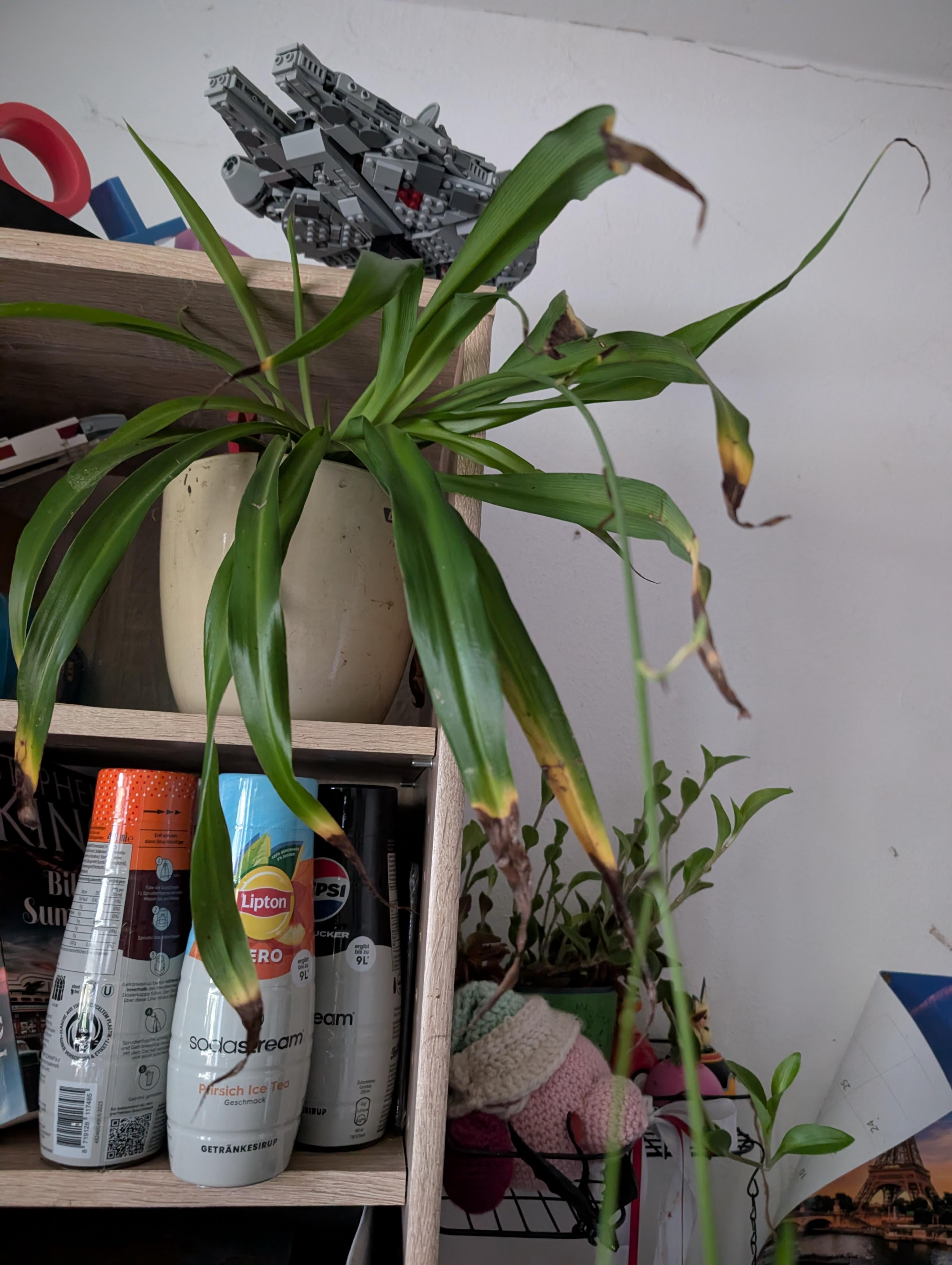 最初は新しい小枝が芽生え、今では茶色の葉が茂っています。土は濡れていなくても乾いていなくても