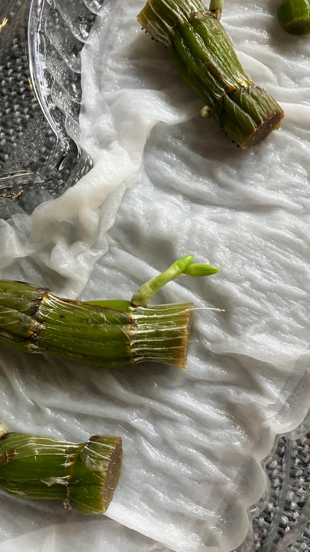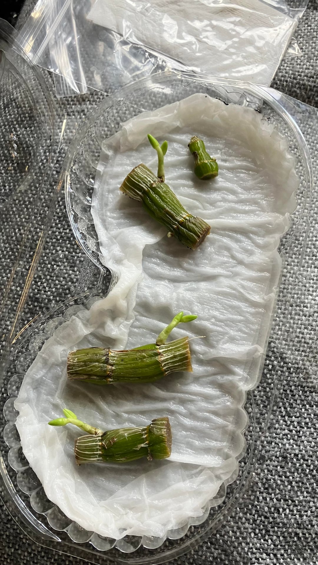 私は竹蘭の植物からこれらの挿し木を増やそうとしていました。それらは古い茎の一部を切り取ってティッシュと一緒に湿った容器に入れただけで、約3.4か月そこにありました。約6週間前にこれらの芽が生えていることに気づきましたが、時間が経つにつれて、それらは茎や根ではなく頭花であるように見えます…。これは正常ですか? 彼らに対して何をする必要がありますか?どうすれば根を生やせるでしょうか? アドバイスをいただければ幸いです…ありがとうございます